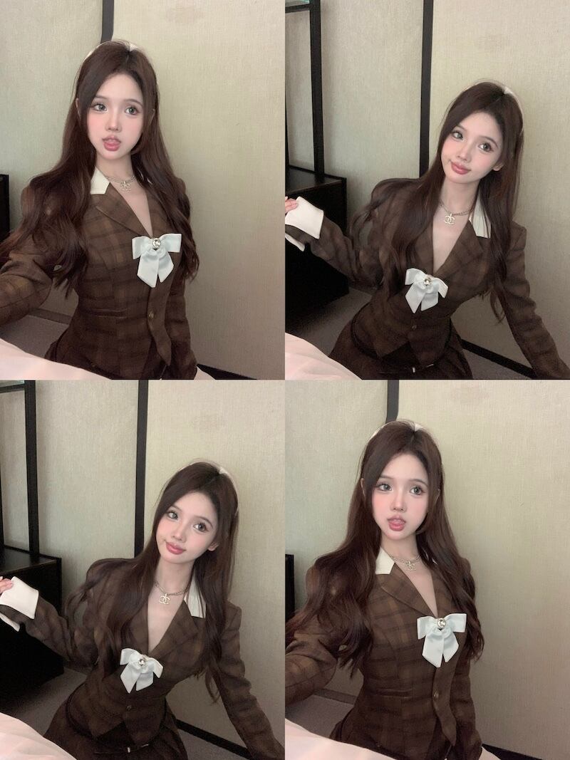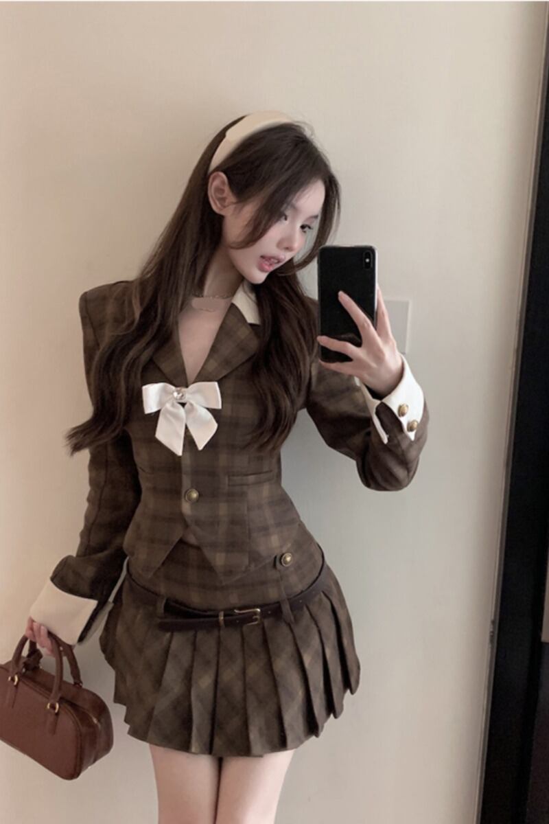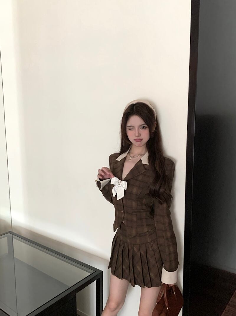 フレンチスタイル甘いホットガールスーツ秋スリムフィットチェック柄ショートコートウエストプリーツミニスカート 2 点セット 大人ガーリー スウィート キュート カジュアル オータム 秋物