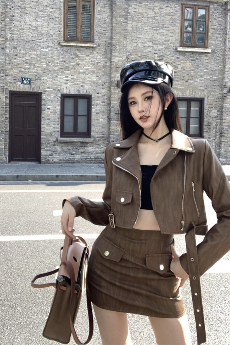 甘いホットガールスーツ秋レトロオートバイ Pu レザーコートウエストミニスカート 2 点セット服 大人ガーリー スウィート キュート カジュアル オータム 秋物