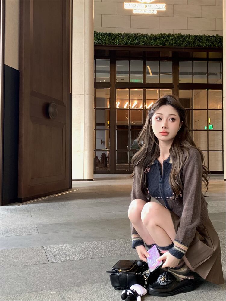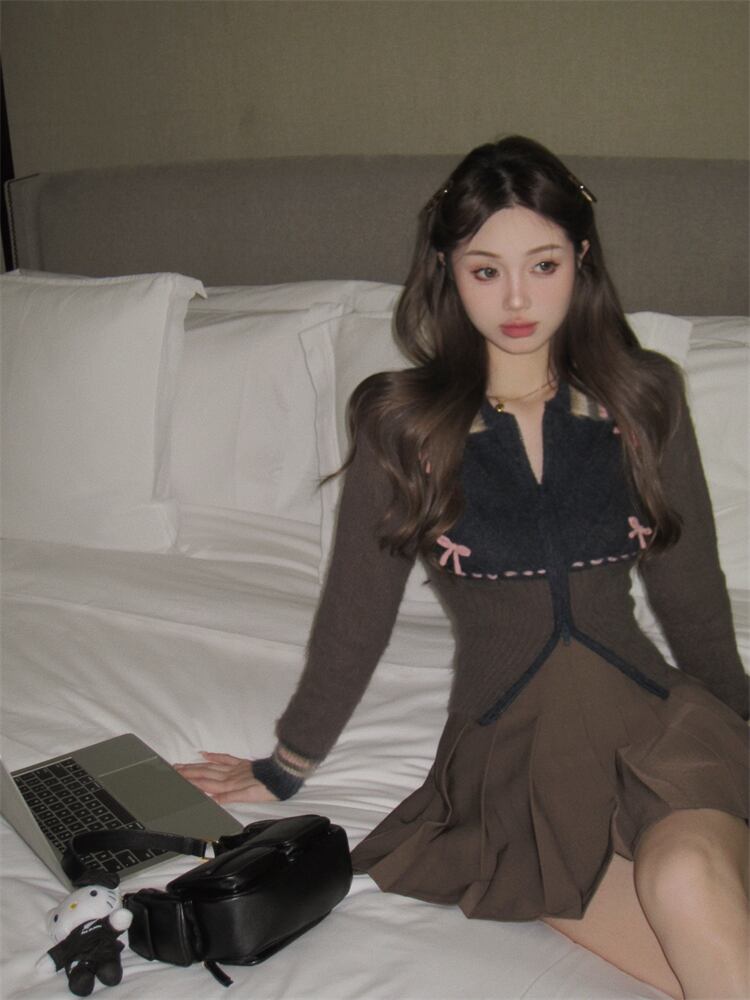 ホットガールスーツ秋ターンダウンニットトップウエスト A ラインプリーツスカート 2 点セット服 オータム 秋物 Aライン