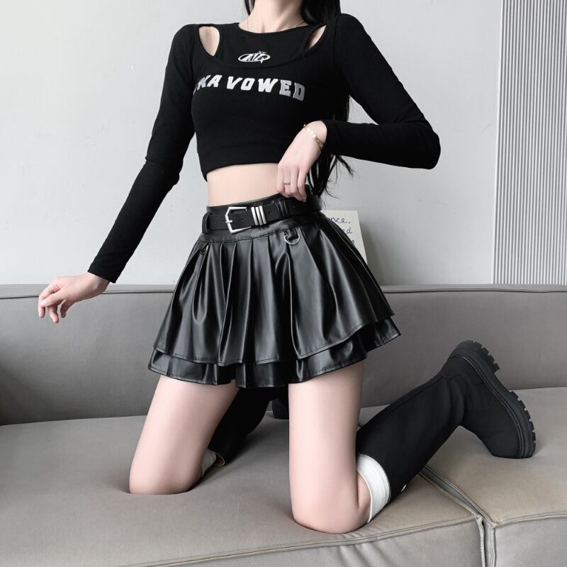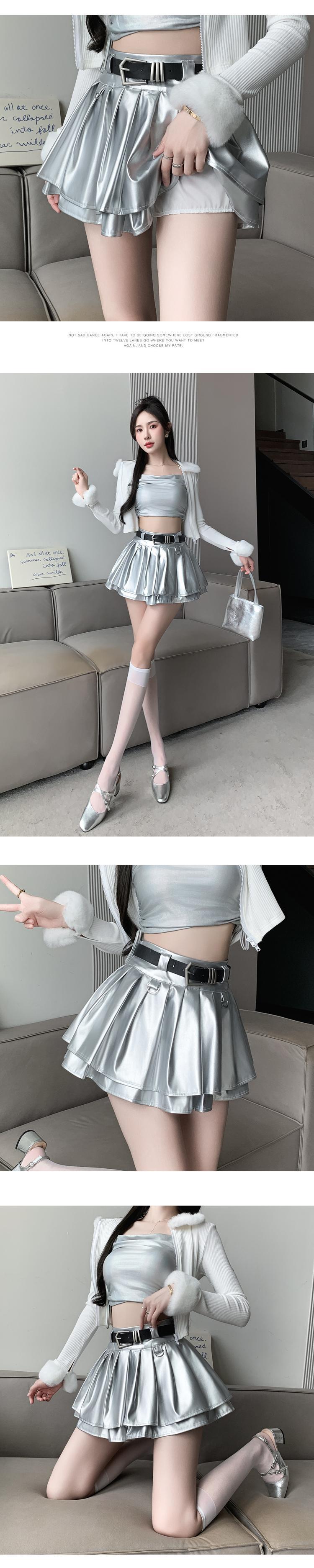 甘いホットガールシルバープリーツミニスカート秋ウエストレザー A ラインショートスカート服 大人ガーリー スウィート キュート カジュアル オータム 秋物 Aライン 銀