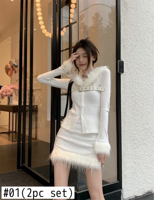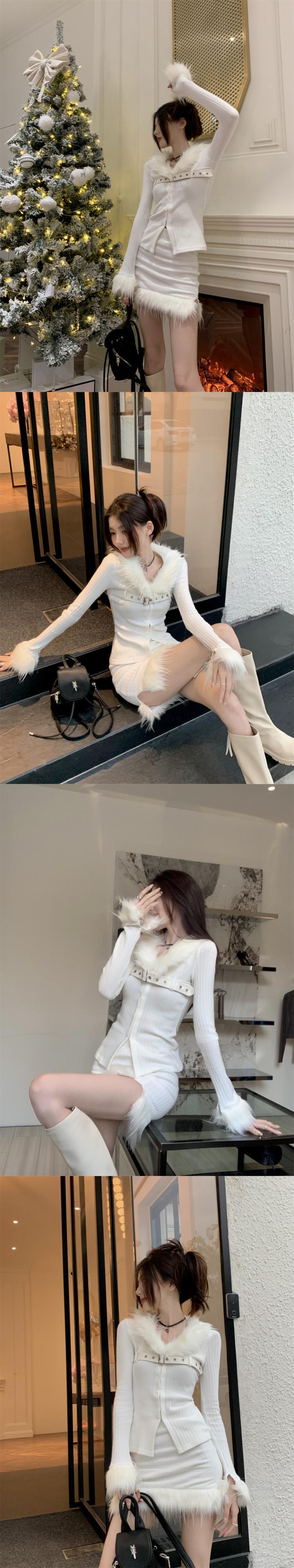 純粋セクシーホットガールスーツ秋毛皮襟ニットカーディガントップラップヒップミニスカートツーピースセット服 オータム 秋物