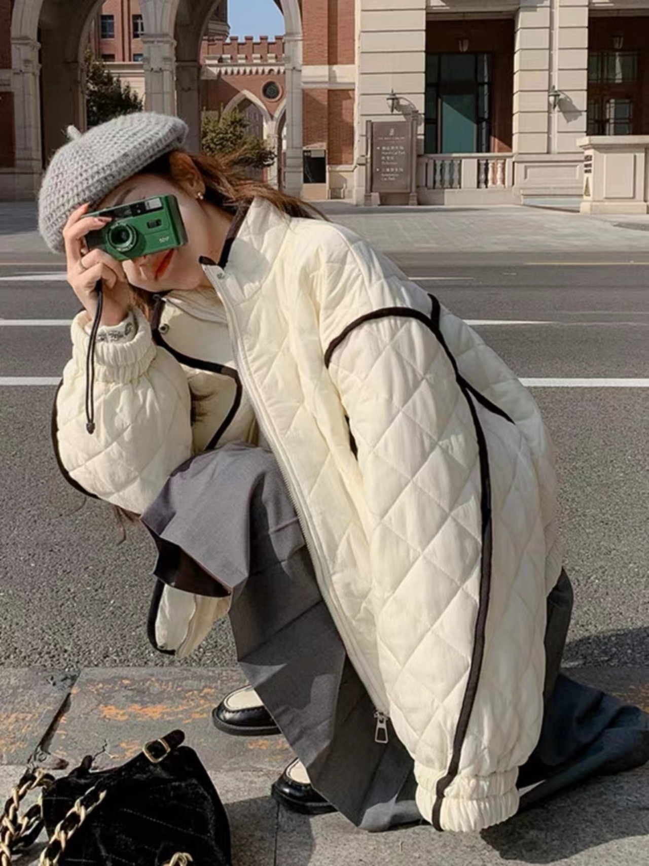 ホットガール白ショート菱形格子軽量コットンジャケット冬ルーズフィット暖かいコットンジャケット服 ホワイト ウィンター 冬物
