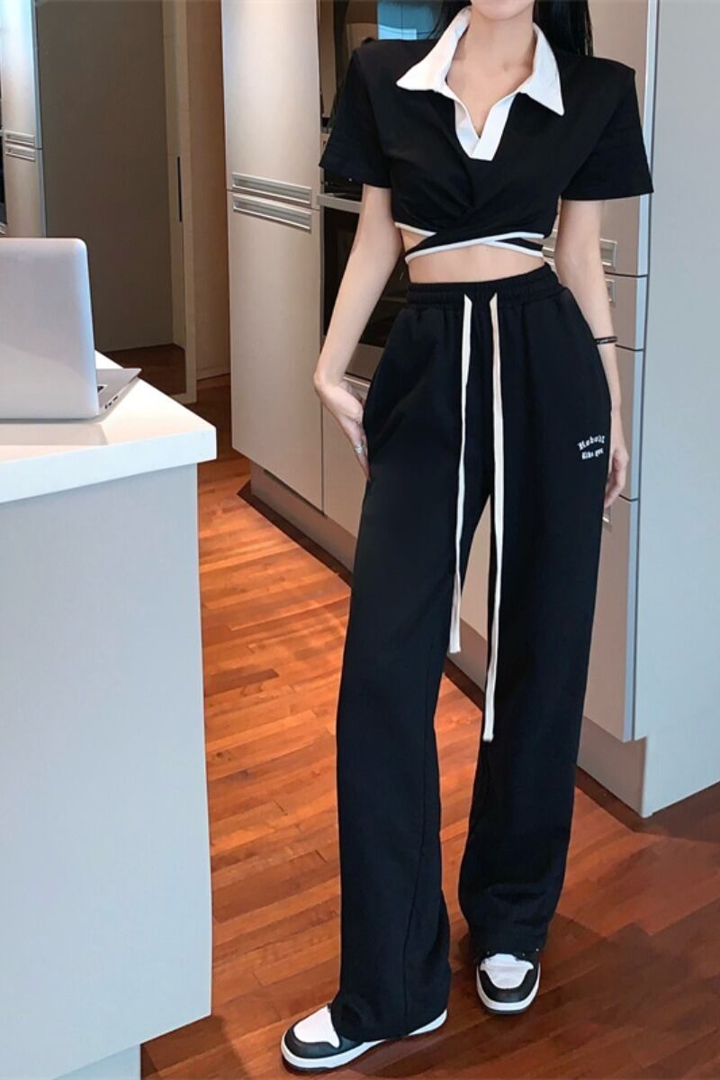 スイートホットガールスーツ秋クロスポロネックトップルーズワイドレッグパンツツーピースセット服 大人ガーリー スウィート キュート カジュアル オータム 秋物 Oネック ワイドパンツ