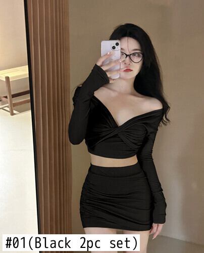 ホットガールズスーツ秋クロス V ネックスリムフィットショート長袖 Tシャツセクシーヒップラップミニスカート 2 点セット ロング オータム 秋物 Vネック