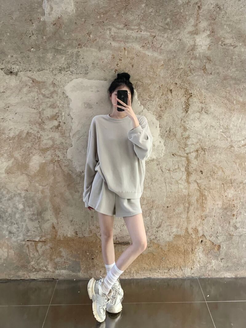 Sweet Girl スーツ レディース 秋 O ネック長袖ルーズプルオーバーウエストショーツ 2 点セット服 ロング 大人ガーリー スウィート キュート カジュアル オータム 秋物 ブルマー Oネック