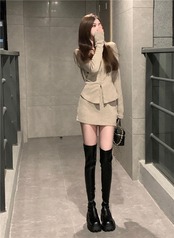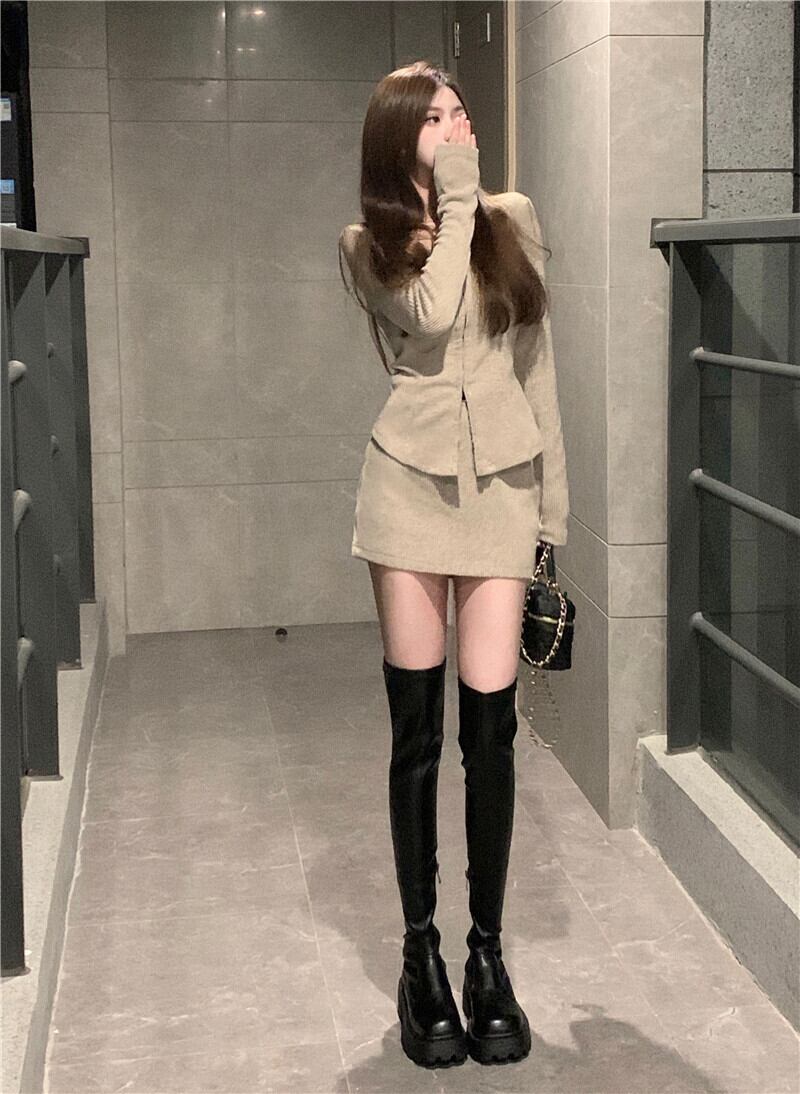 フレンチスイートホットガールスーツ レディース秋スクエアカラー長袖ニットシャツウエストショートスカート 2点セット ロング 大人ガーリー スウィート キュート カジュアル オータム 秋物 スクウェア