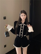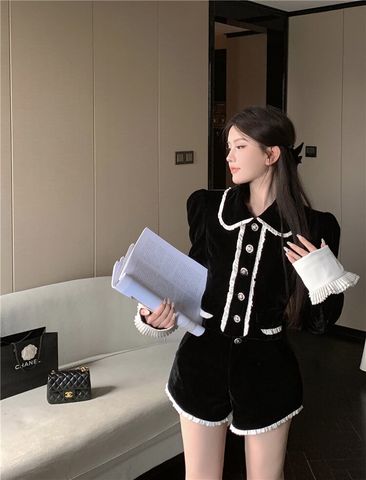 甘いホットガール黒ベルベットスーツ秋コントラストあるターンダウンカラーショートジャケットウエストショーツ 2 点セット ブラック 大人ガーリー スウィート キュート カジュアル オータム 秋物 ブルマー