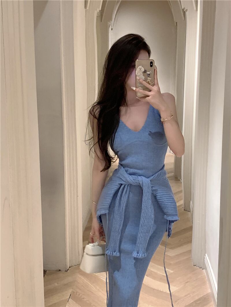 ホットガールレトロスーツ秋長袖食用木菌ニットカーディガン V ネックスリムフィットドレス 2 点セット ロング オータム 秋物 Vネック