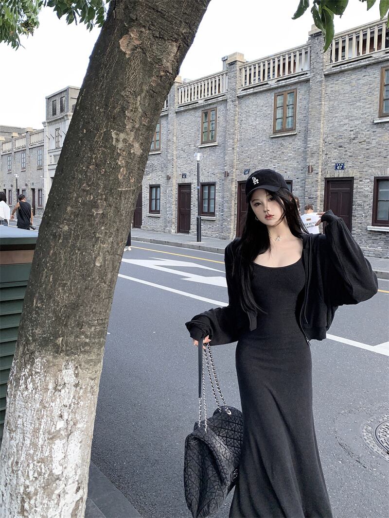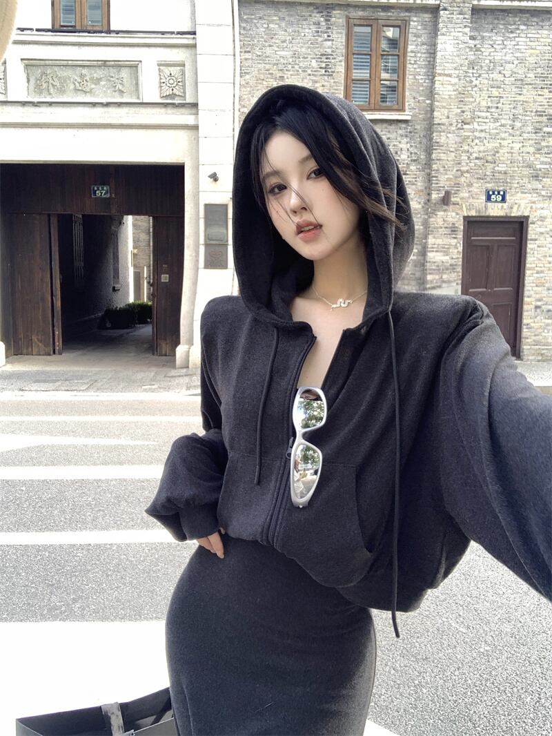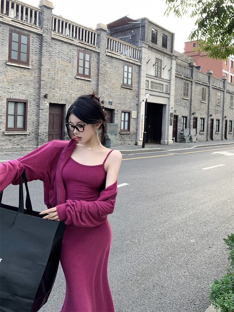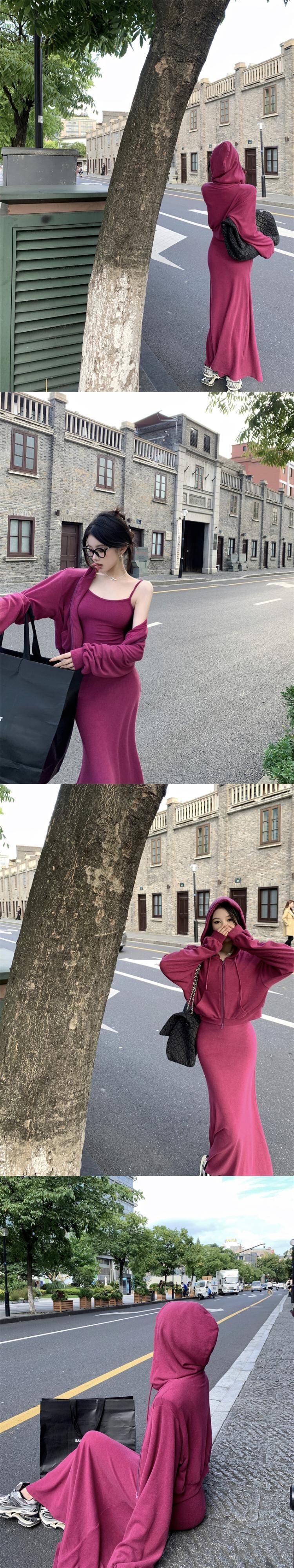 甘いホットガールスーツ秋フード付きジッパーカーディガントップスリムストラップマーメイドドレスツーピースセット服 レッド 大人ガーリー スウィート キュート カジュアル オータム 秋物