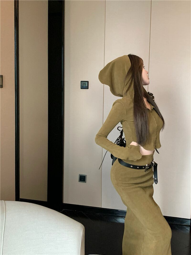 アメリカンスイートホットガールズスーツ秋フード付きスリムフィットトップウエストロングスカートツーピースセット服 大人ガーリー スウィート キュート カジュアル オータム 秋物