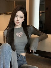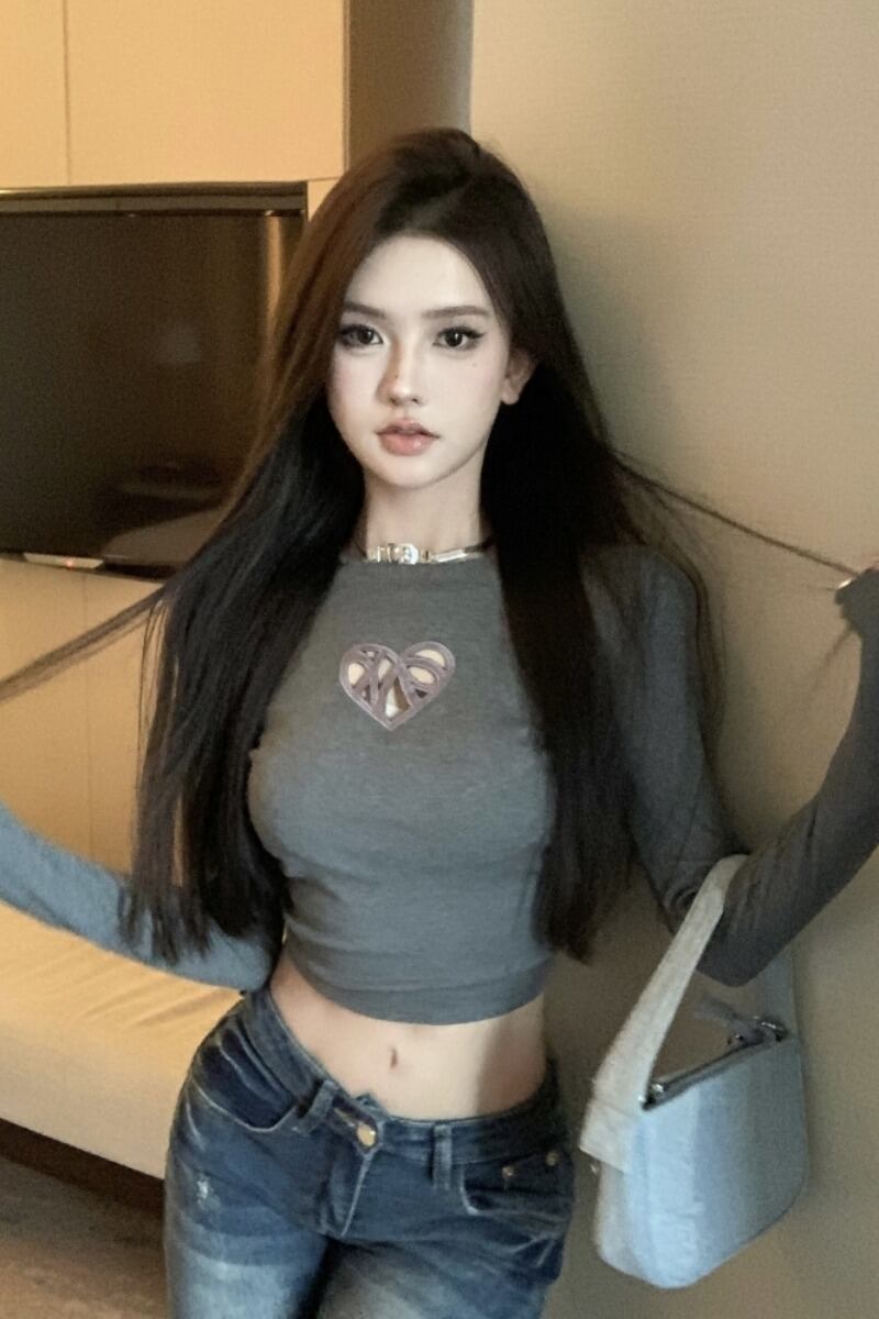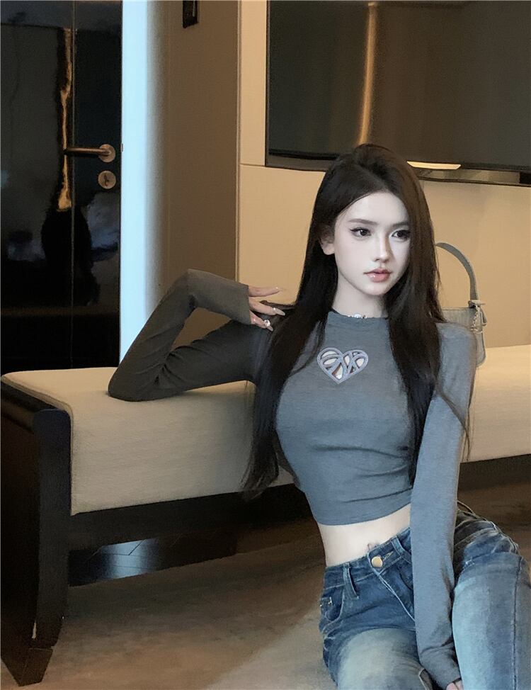 アメリカンスウィートホットガールズ中空アウトTシャツ秋スリムフィット長袖Tシャツショートトップ服 ロング 大人ガーリー キュート カジュアル オータム 秋物