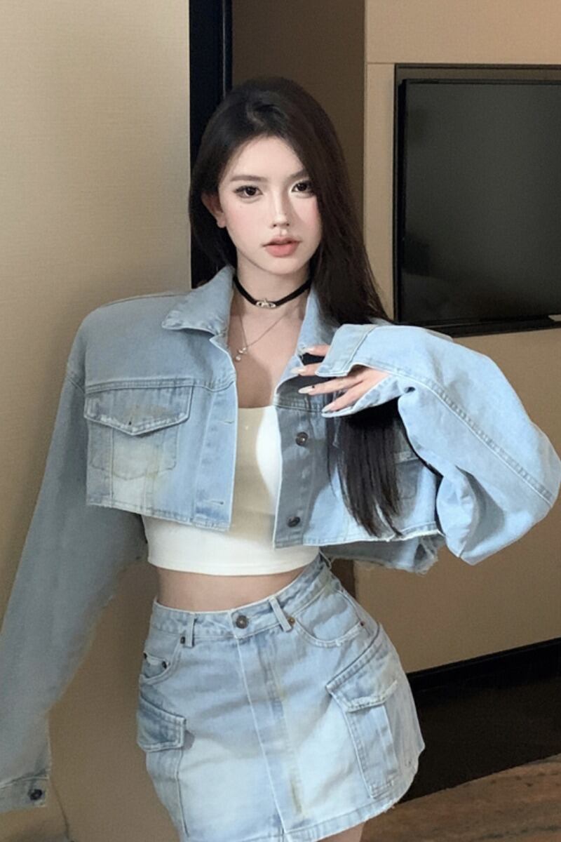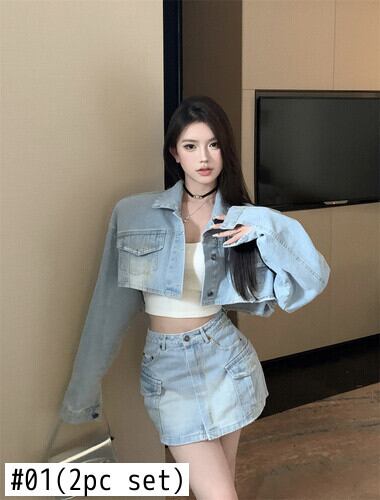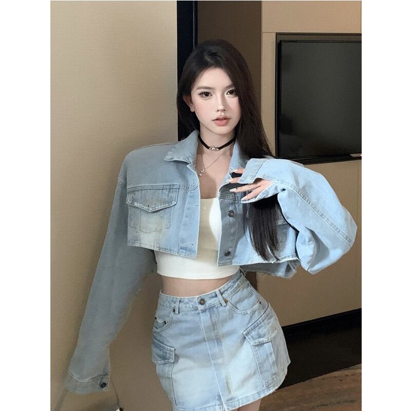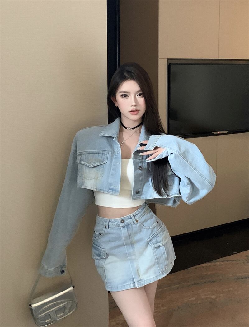 アメリカンホットガールズデニムスーツ秋ショート長袖ジャケットコートウエストミニスカートツーピースセット服 ロング オータム 秋物