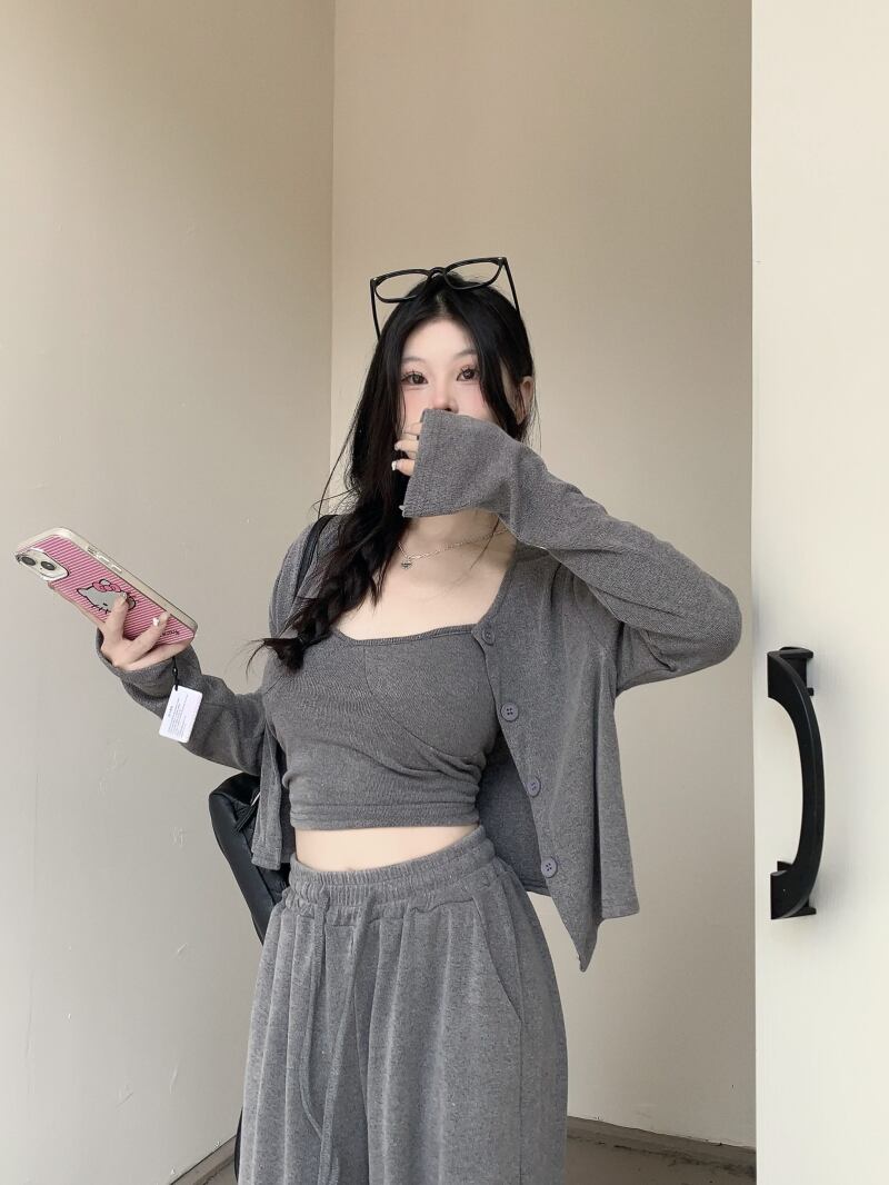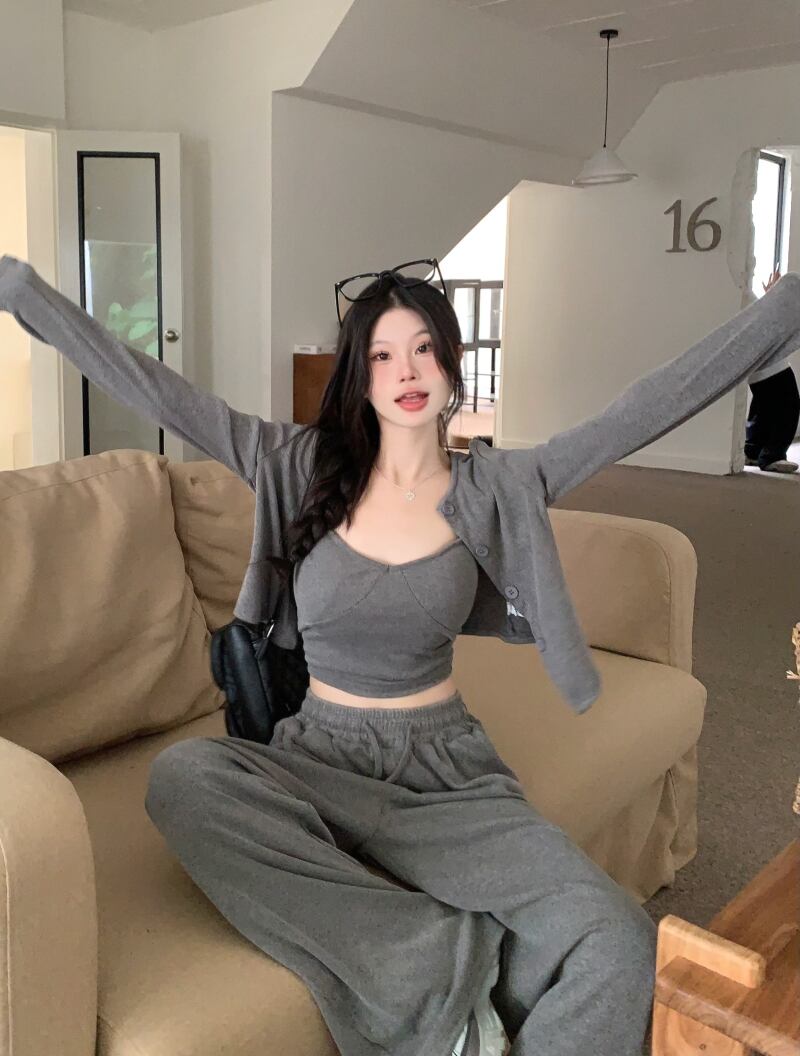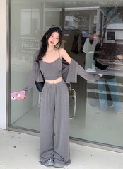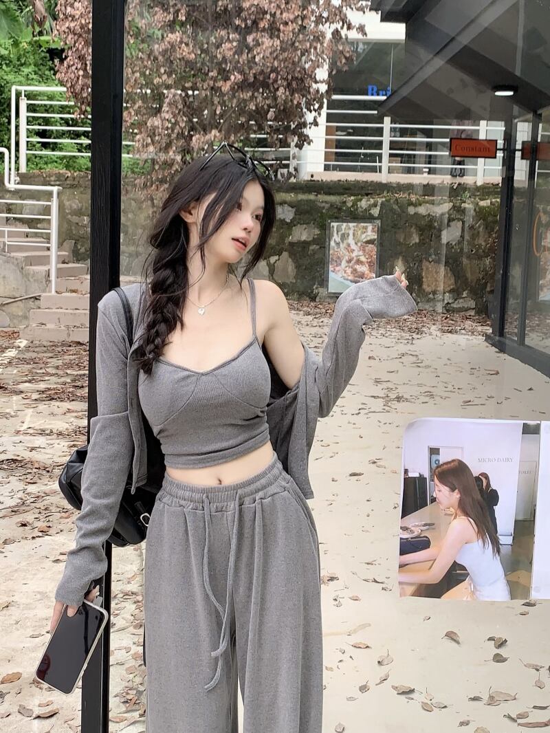 ホットガールスーツ秋長袖カーディガンキャミソールワイド脚パンツ 3 点セット服 ロング オータム 秋物 ワイドレッグ ワイドパンツ