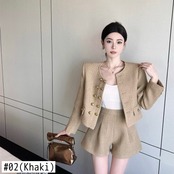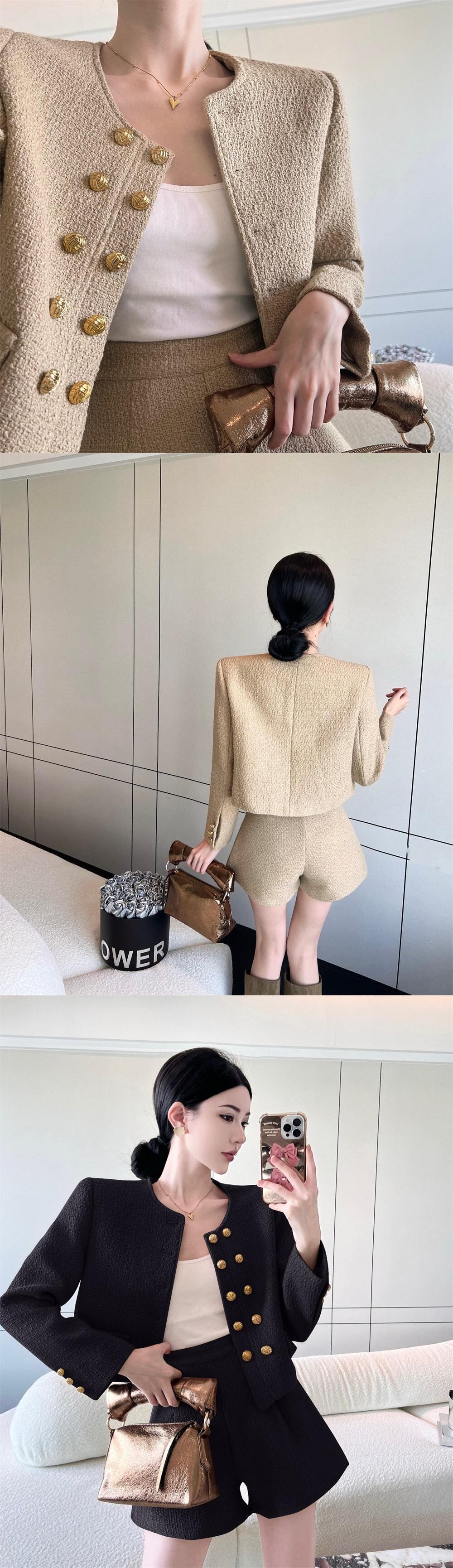 オフィスレディスーツ秋メタルボタン長袖ツイードコートウエストワイドレッグショーツ 2 点セット服 ロング オータム 秋物 ブルマー ワイドパンツ 会社 学校 通勤や通学にも