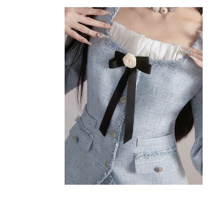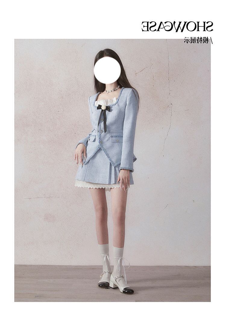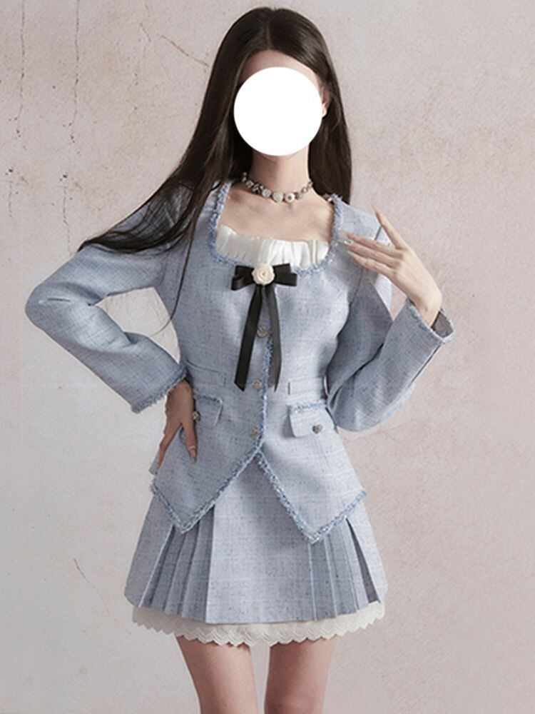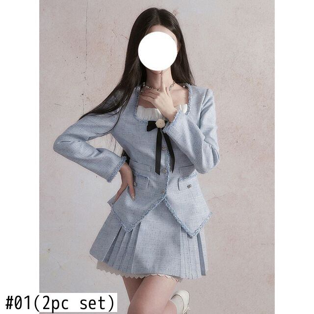 スイートガールスタイルスーツ秋スクエアカラースリムフィットコートウエストスカートツーピースセット服 大人ガーリー スウィート キュート カジュアル オータム 秋物 スクウェア