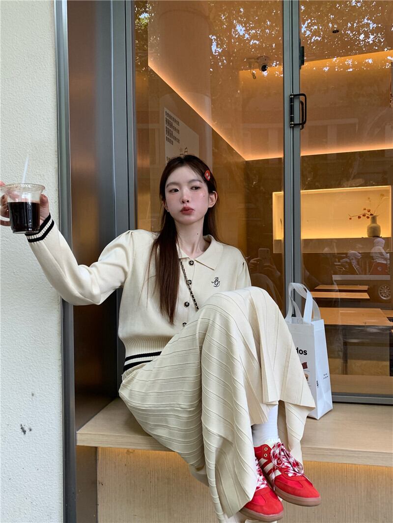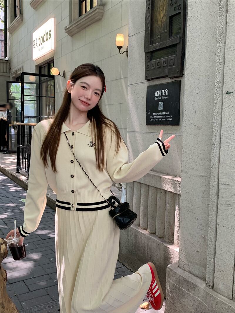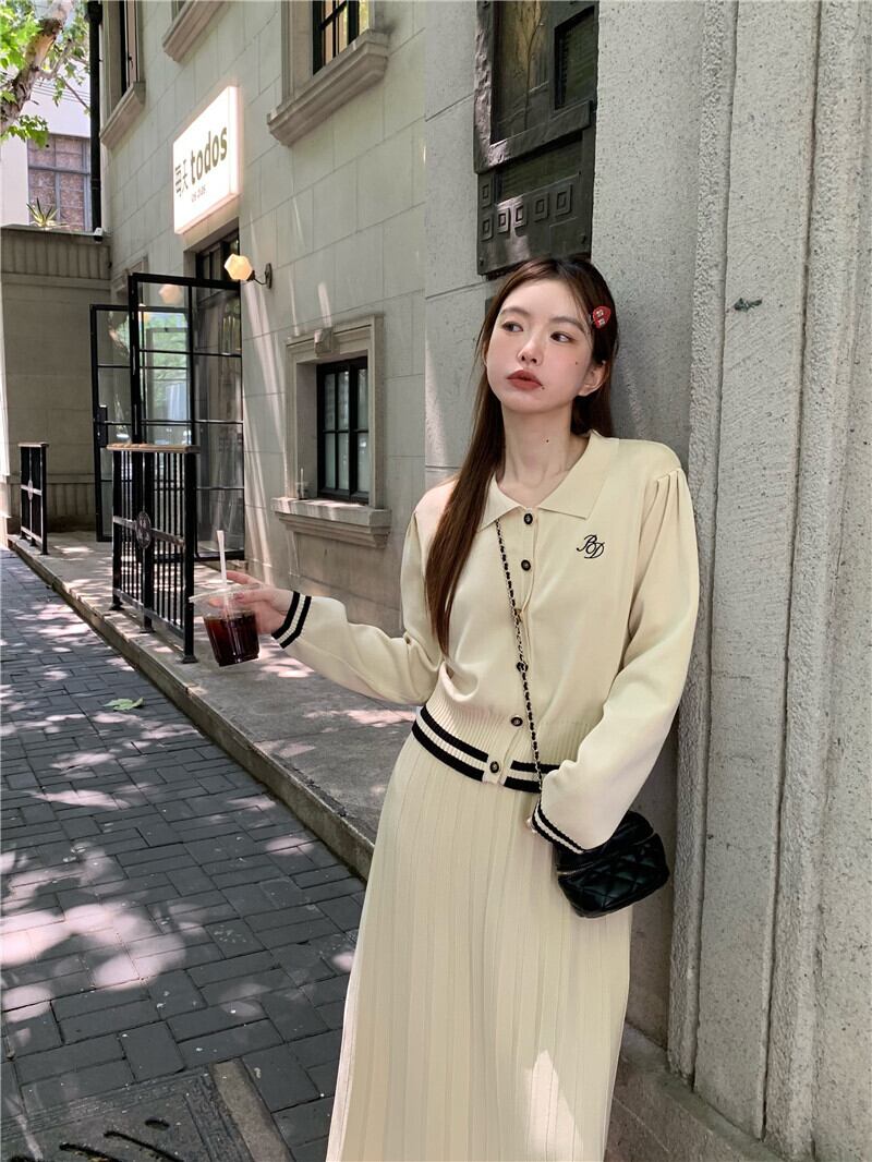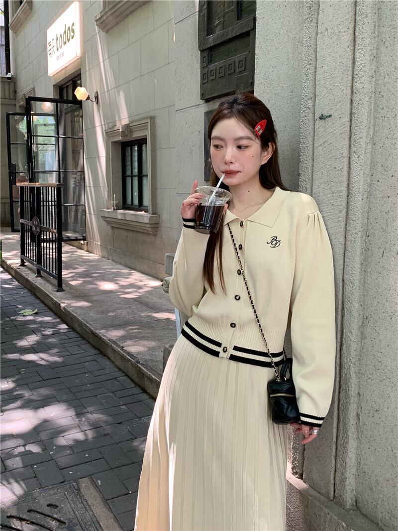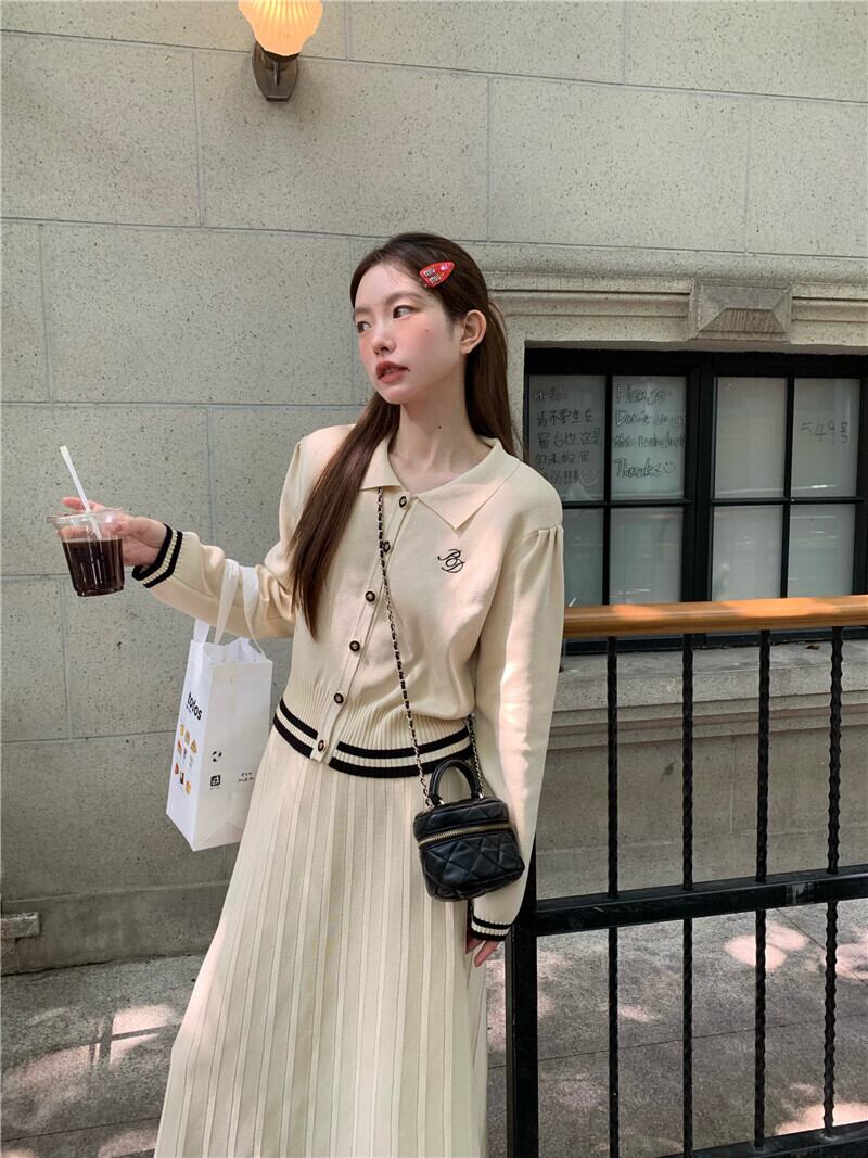 ホットガールプレッピースタイルスーツ秋ポロ長袖ニットカーディガンウエストロングスカートツーピースセット服 オータム 秋物