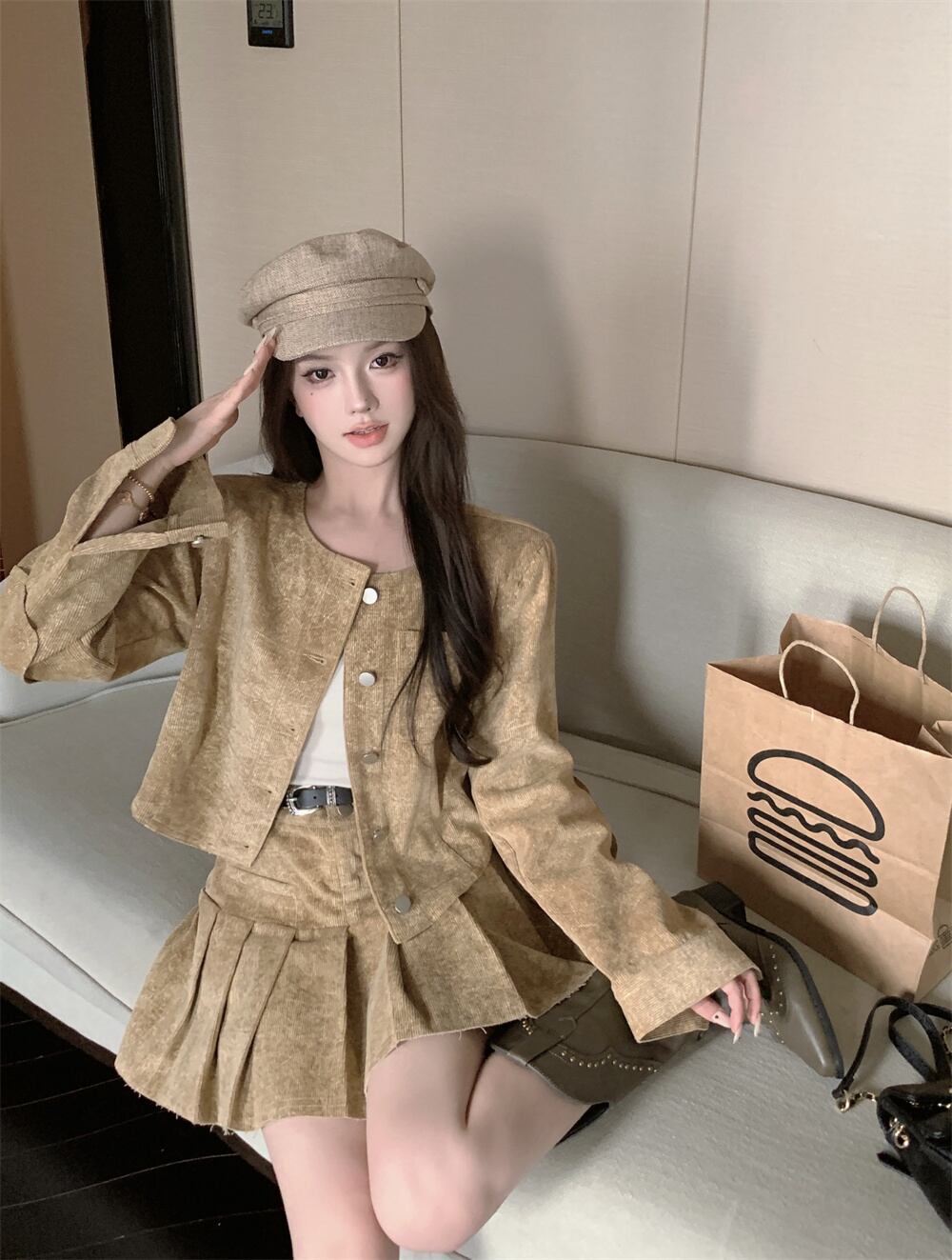 フレンチスタイルスウィートガールスーツ秋スリムフィットOネックショートコートウエストAラインプリーツスカート服 大人ガーリー キュート カジュアル オータム 秋物