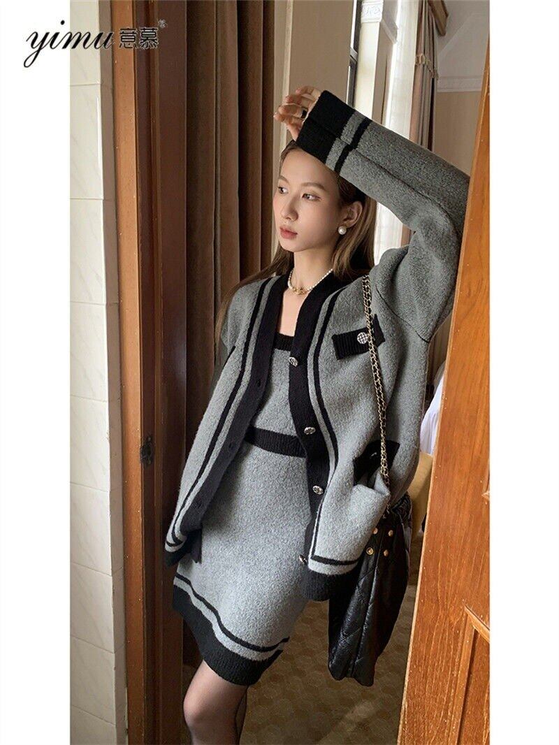 Sweet Girl スーツ レディース 秋冬 ニット ストラップ ショートドレス 長袖 ルーズ カーディガン 2点セット 服 ロング 大人ガーリー スウィート キュート カジュアル オータム 秋物 ウィンター 冬物