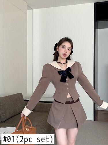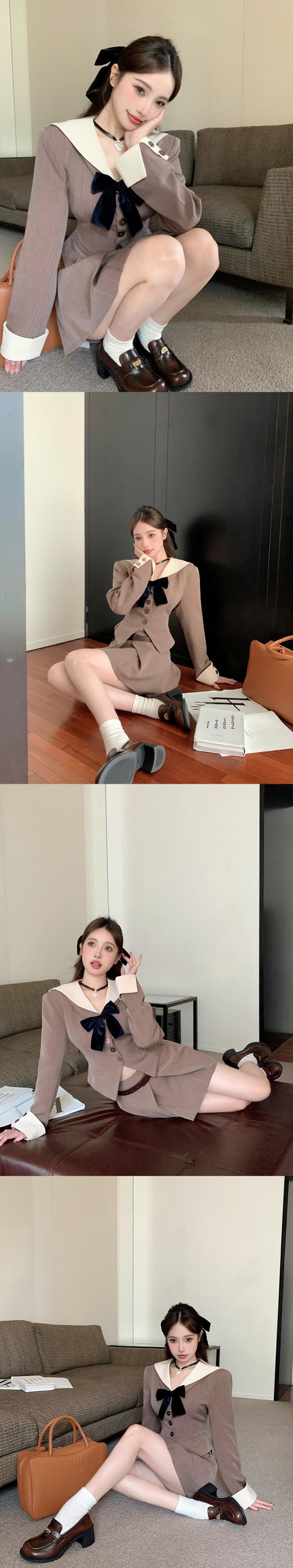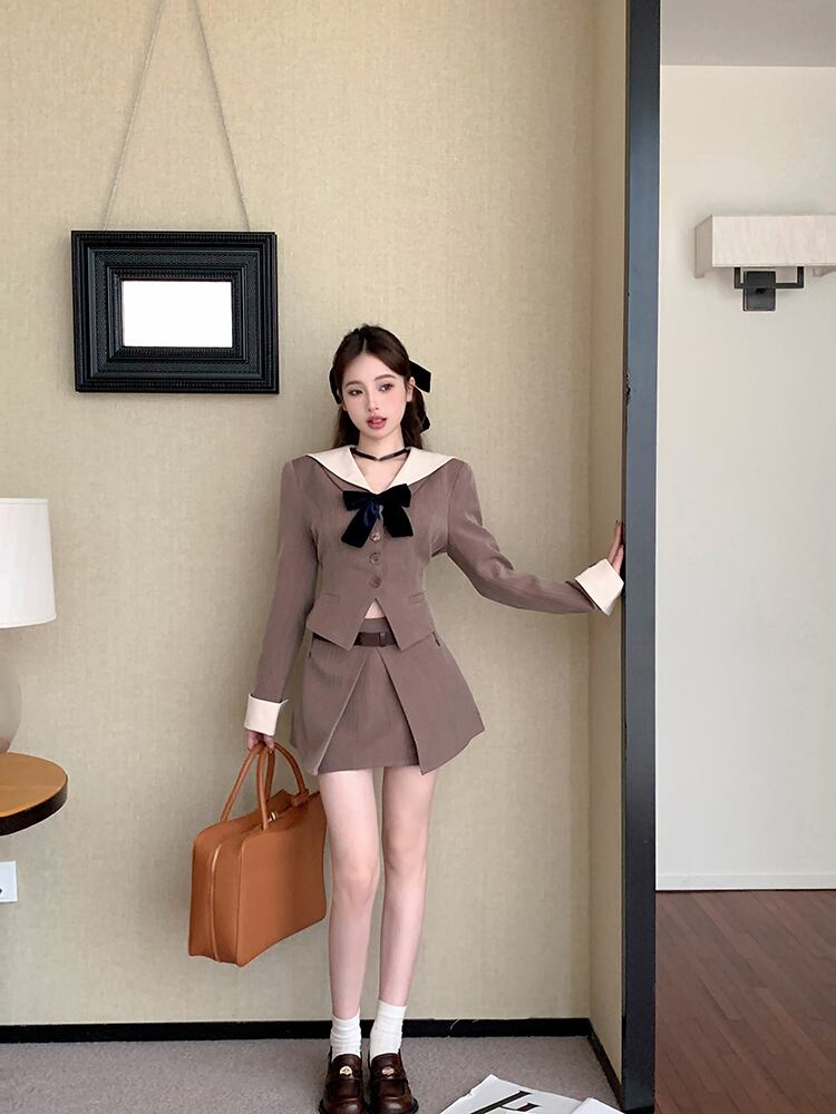 スイートガールスーツ秋セーラー襟スリムフィット長袖コートブラウン A ラインショートスカート 2 点セット服 ロング 大人ガーリー スウィート キュート カジュアル オータム 秋物 Aライン