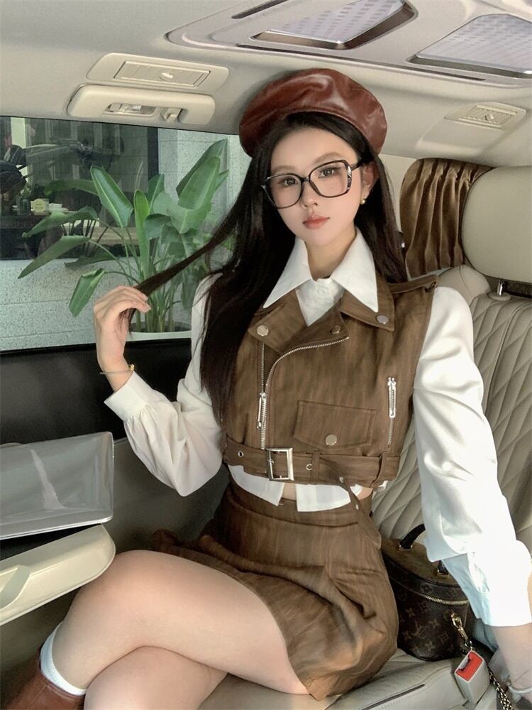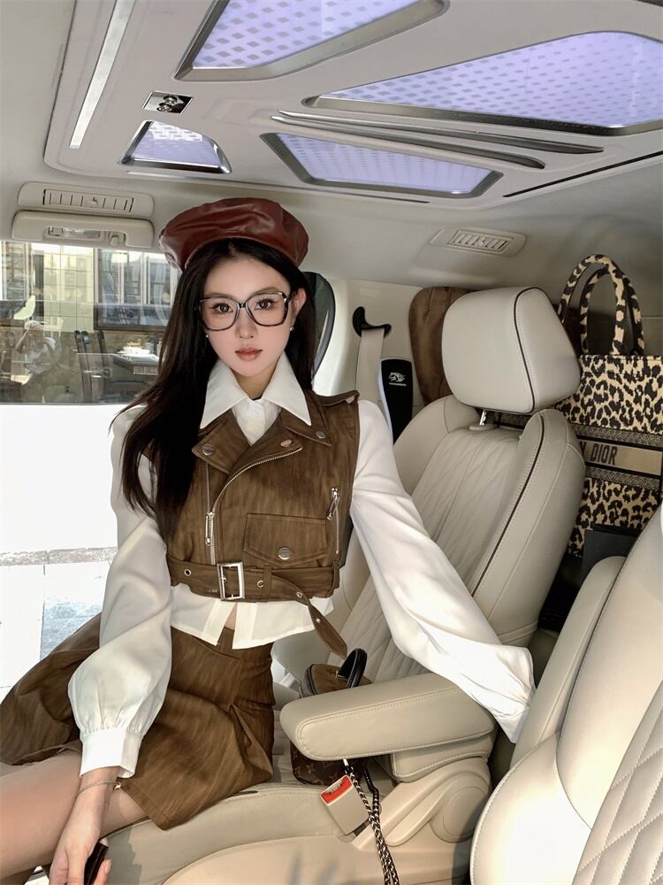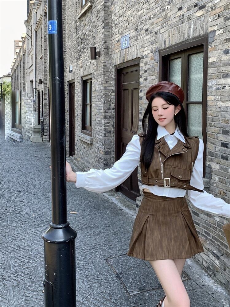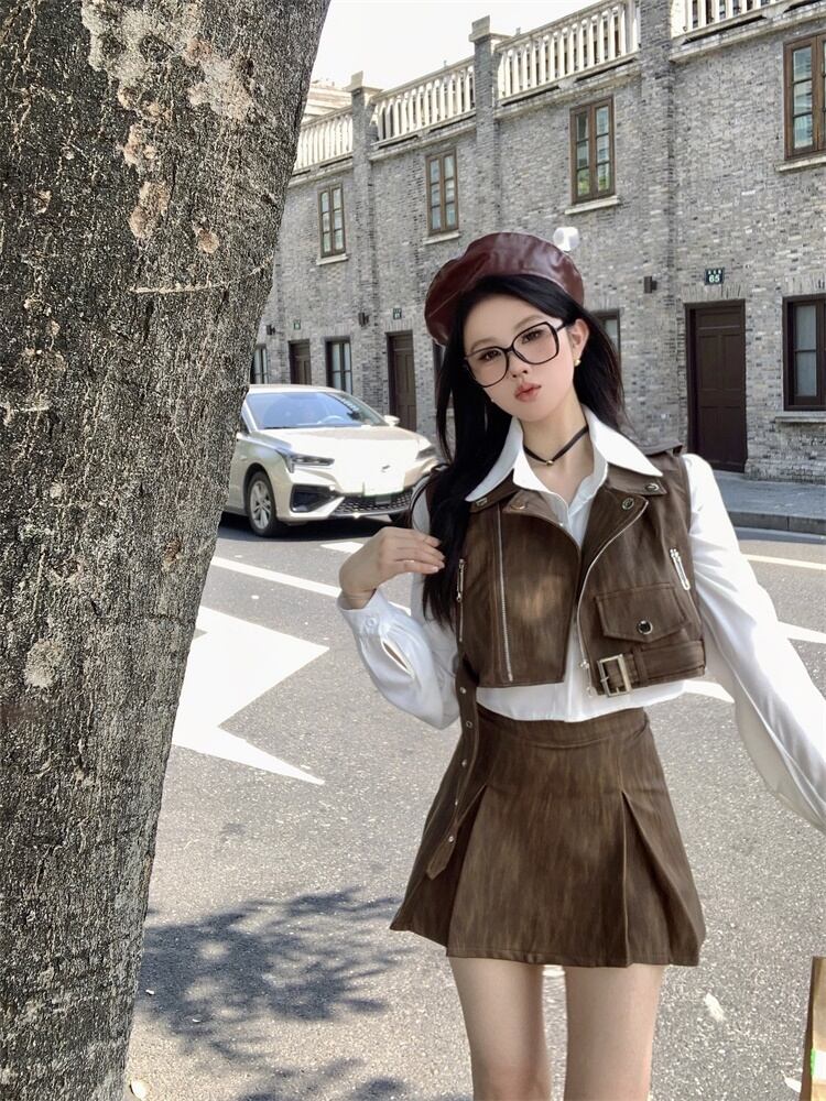 Sweet Girl レトロスーツ秋オートバイ Pu レザーベストシャツウエストスカート 3 点セット服 大人ガーリー スウィート キュート カジュアル オータム 秋物