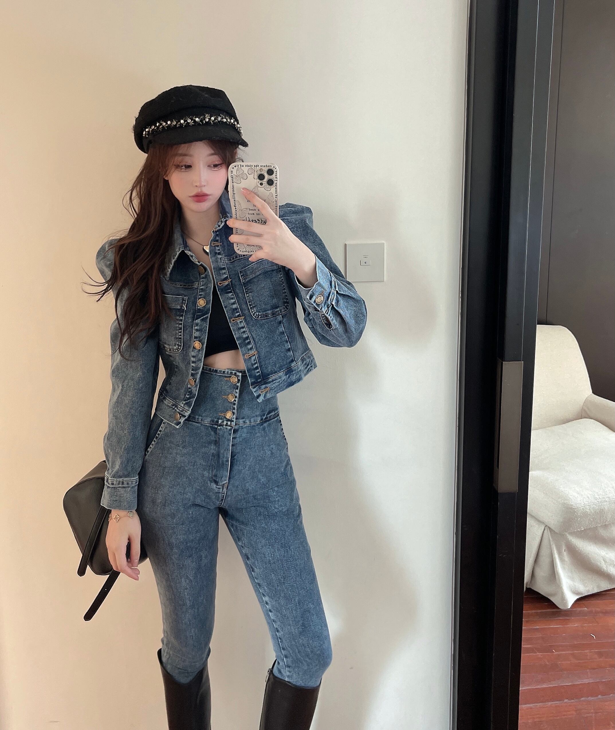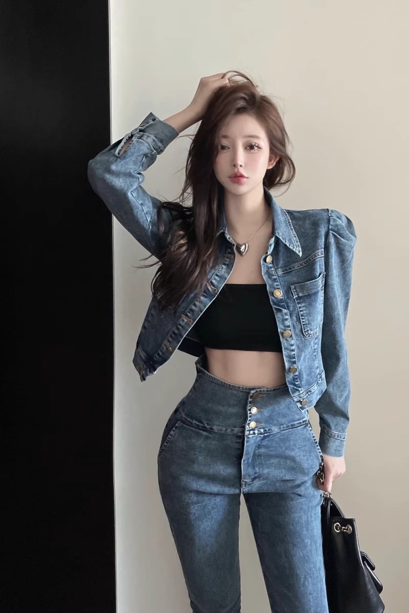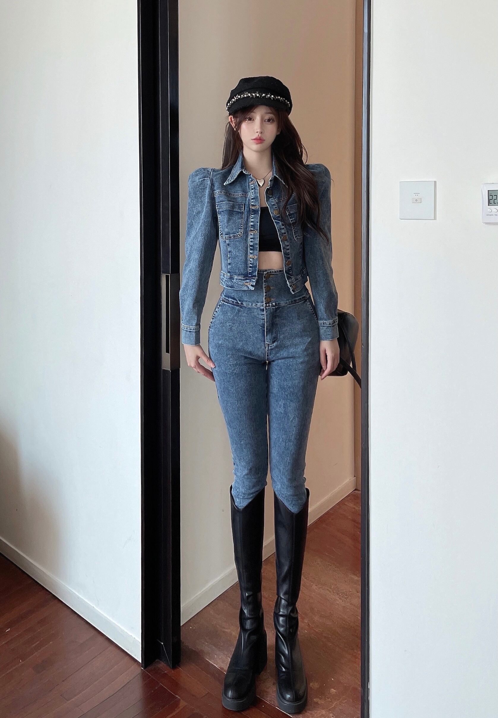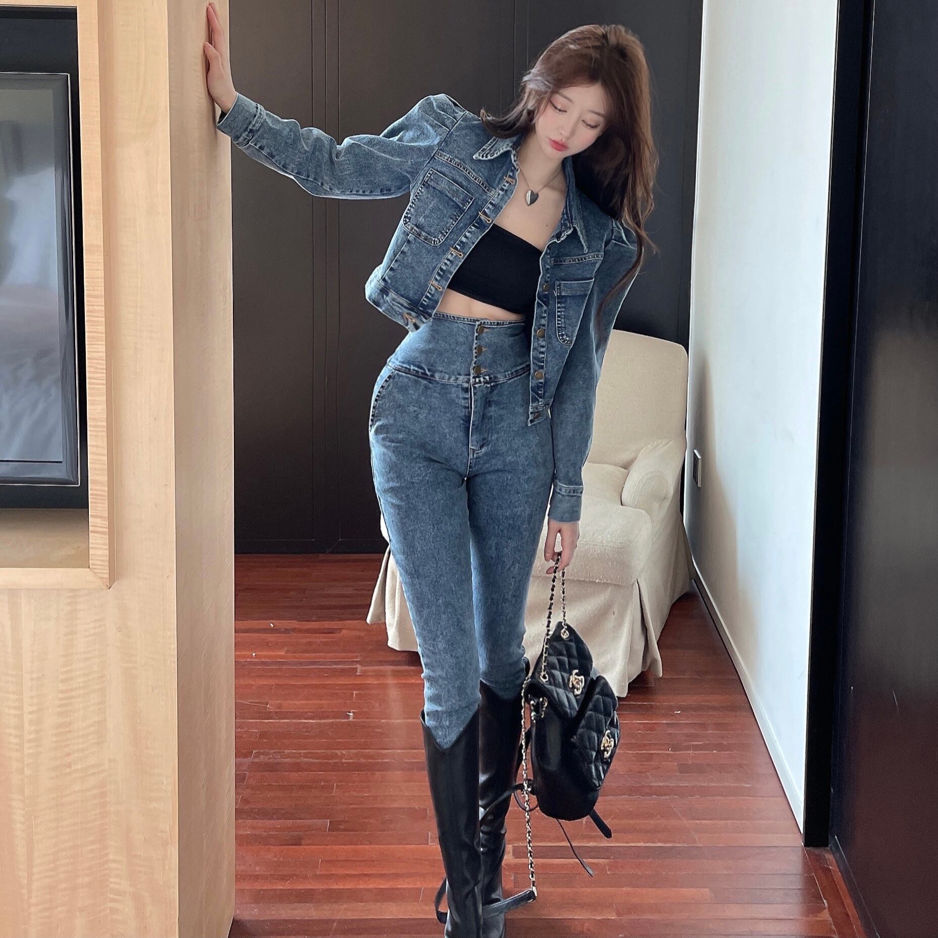 クールホットガールデニムスーツ秋シングルブレストバブルスリーブジャケットコートウエストペンシルパンツ 2 点セット オータム 秋物
