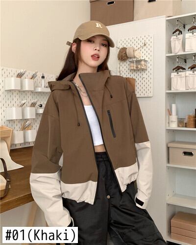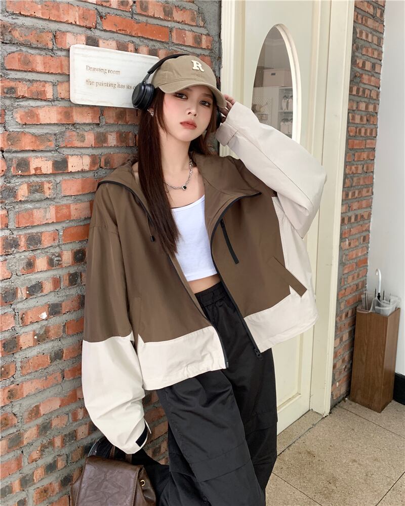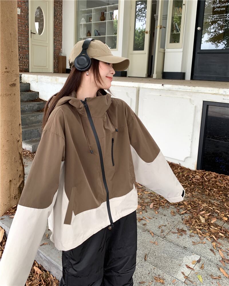 ホットガールコントラストフード付きジャケット秋長袖ルーズチャージ立ち襟コート服 ロング オータム 秋物