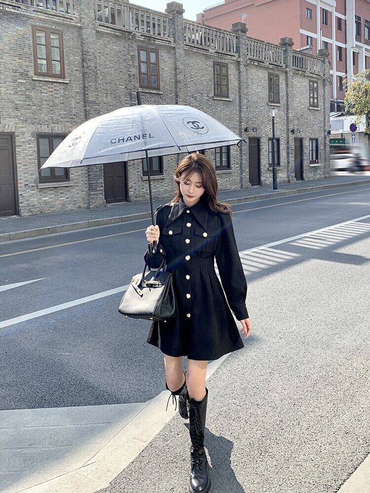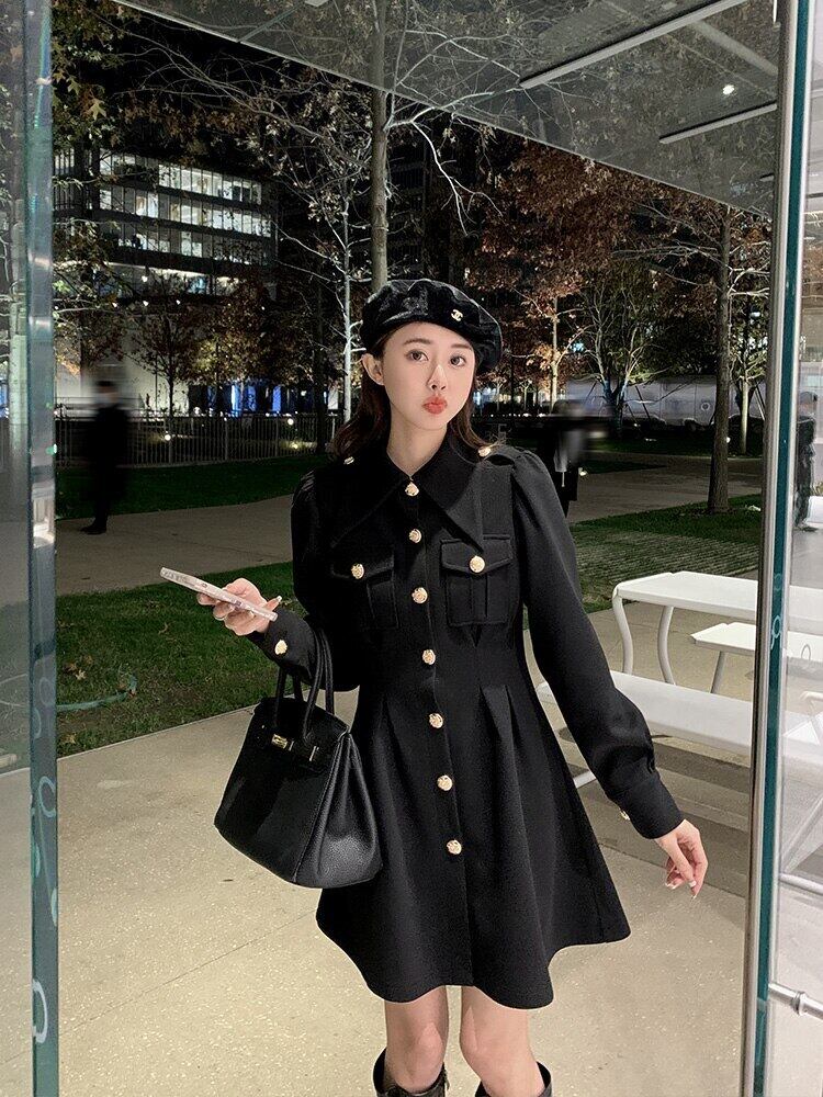 甘いホットガールウールスーツドレス長袖ターンダウン襟 A ラインスリムフィットブラックドレス服 ロング 大人ガーリー スウィート キュート カジュアル Aライン