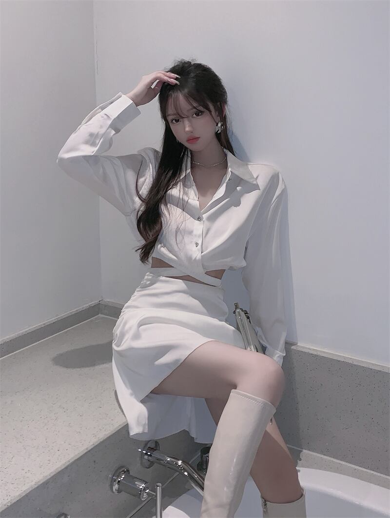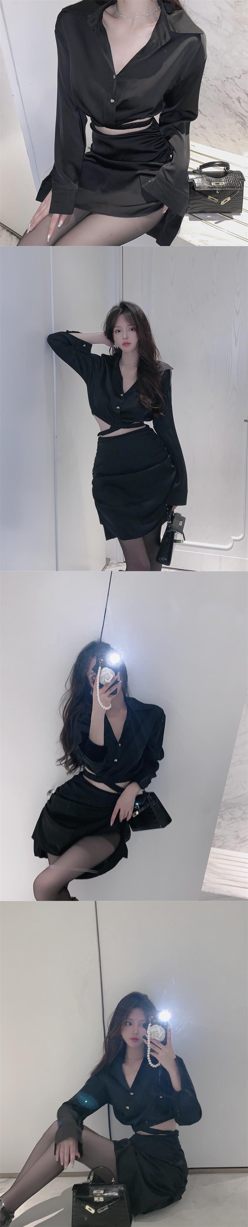 ホットガールスーツ秋レースアップサテン長袖シャツ不規則プリーツスカートツーピースセット服 ロング オータム 秋物 ソリッドカラー