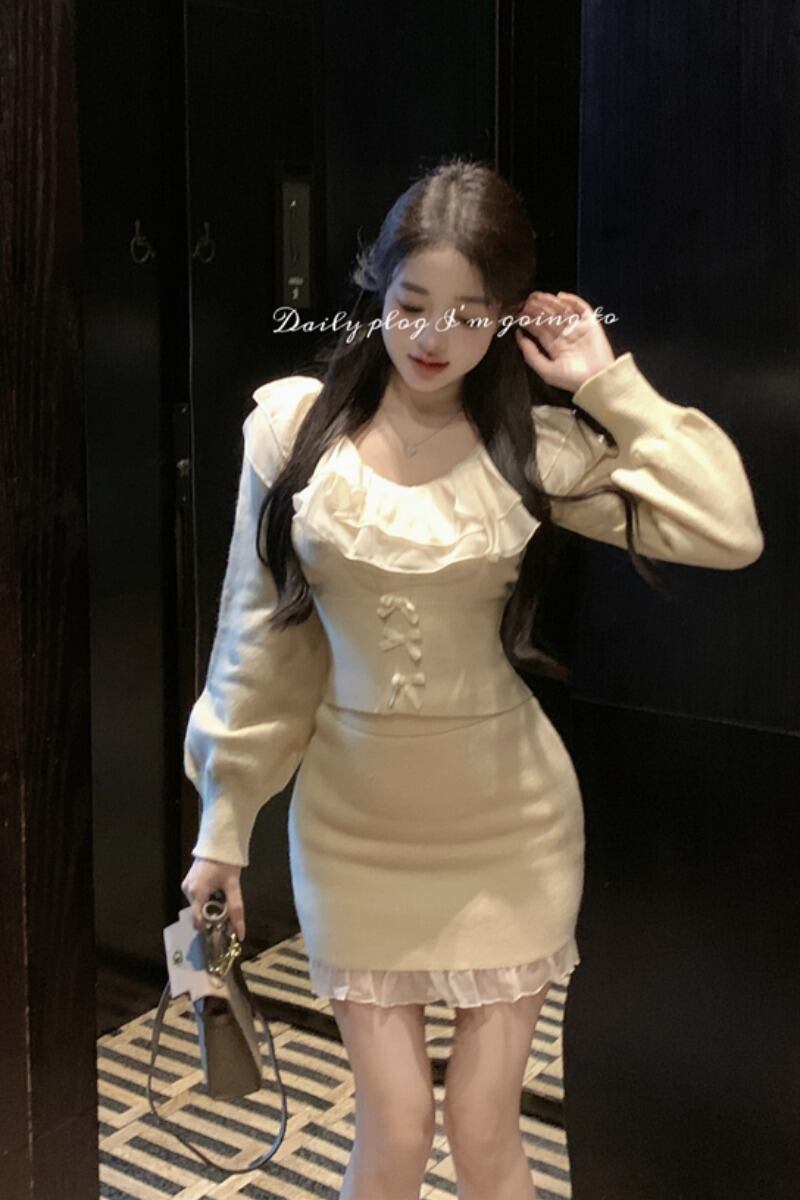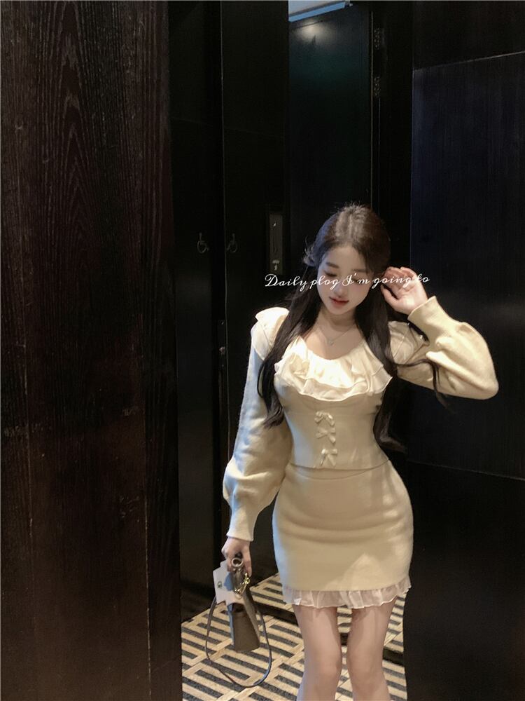 フレンチホットガールズスーツ秋フリルエッジ U ネックニットシャツウエストラップヒップミニスカート 2 点セット オータム 秋物