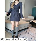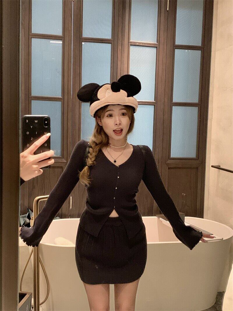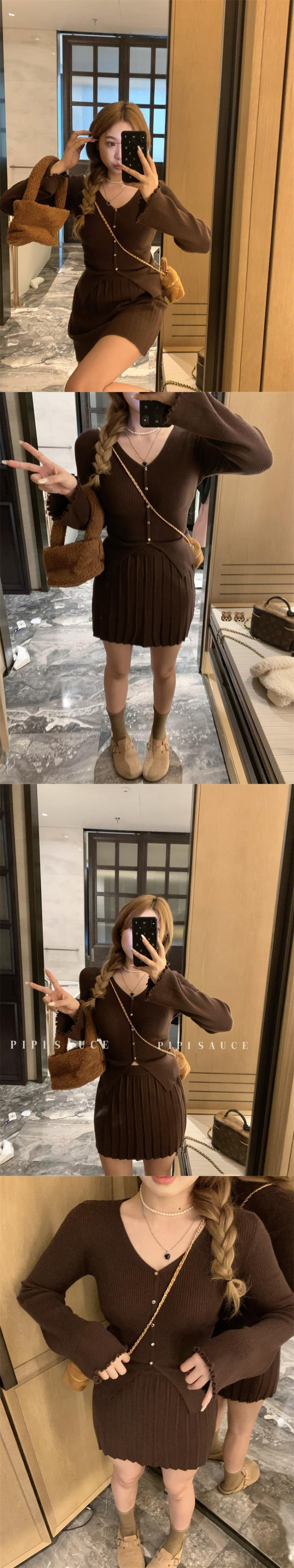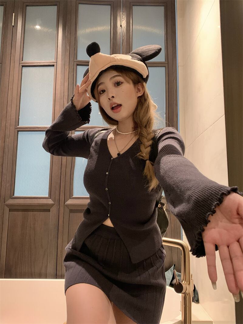 甘いホットガールスーツ秋ストライプコーヒー V ネック長袖ニットカーディガン A ラインミニスカート服 ロング 大人ガーリー スウィート キュート カジュアル オータム 秋物 Vネック Aライン