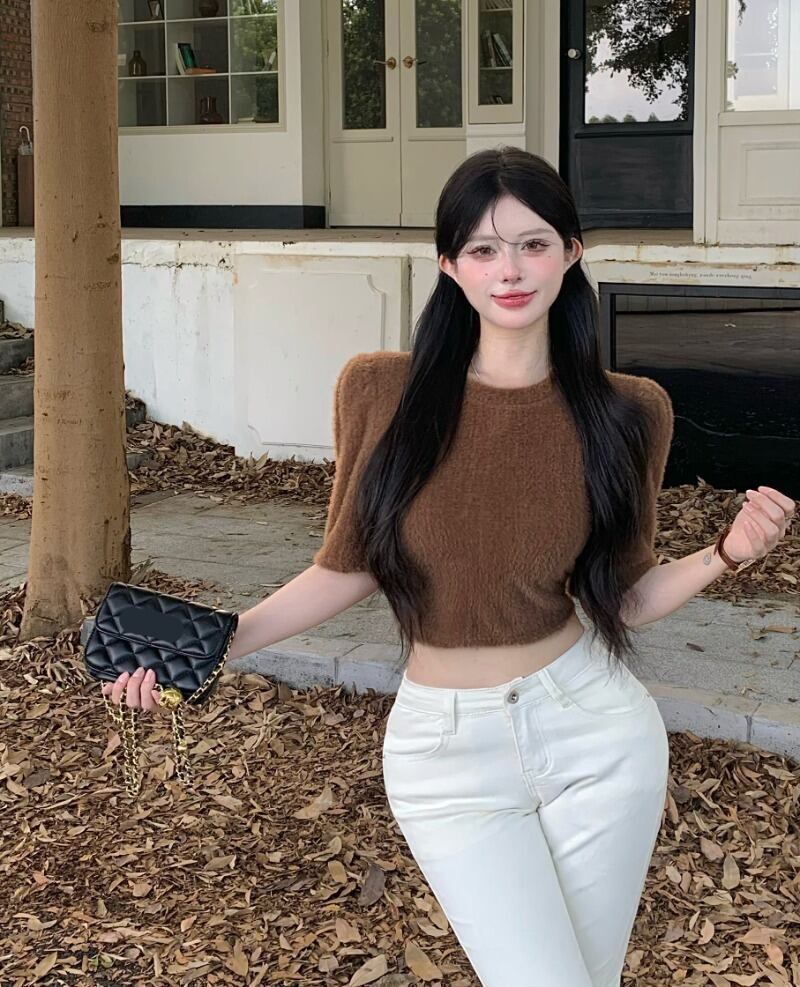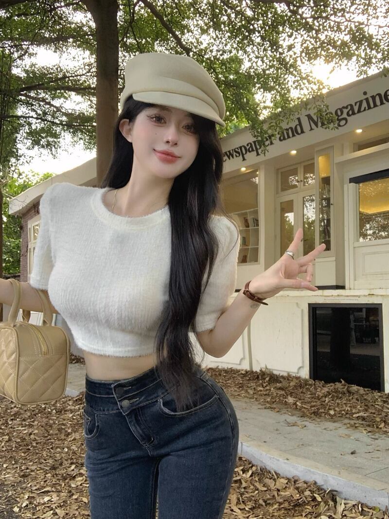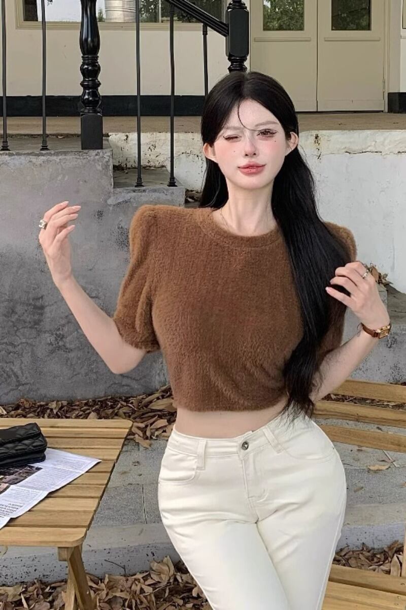 ホットガールラウンドネック多用途バブルスリーブセーター秋スリムフィットショートニット服 オータム 秋物 Oネック