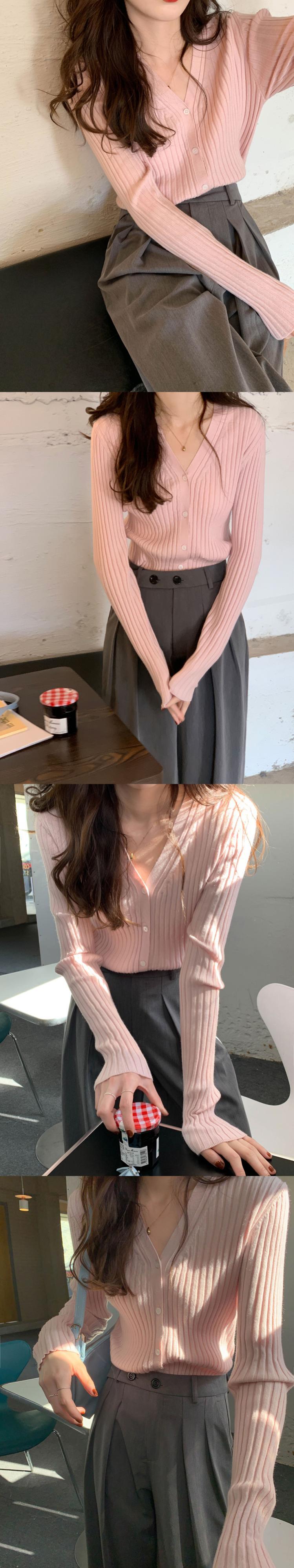 スタイルソフトピンクピットストライプ V ネックニットカーディガン秋スリムフィットボトム多用途トップ服 オータム 秋物 Vネック