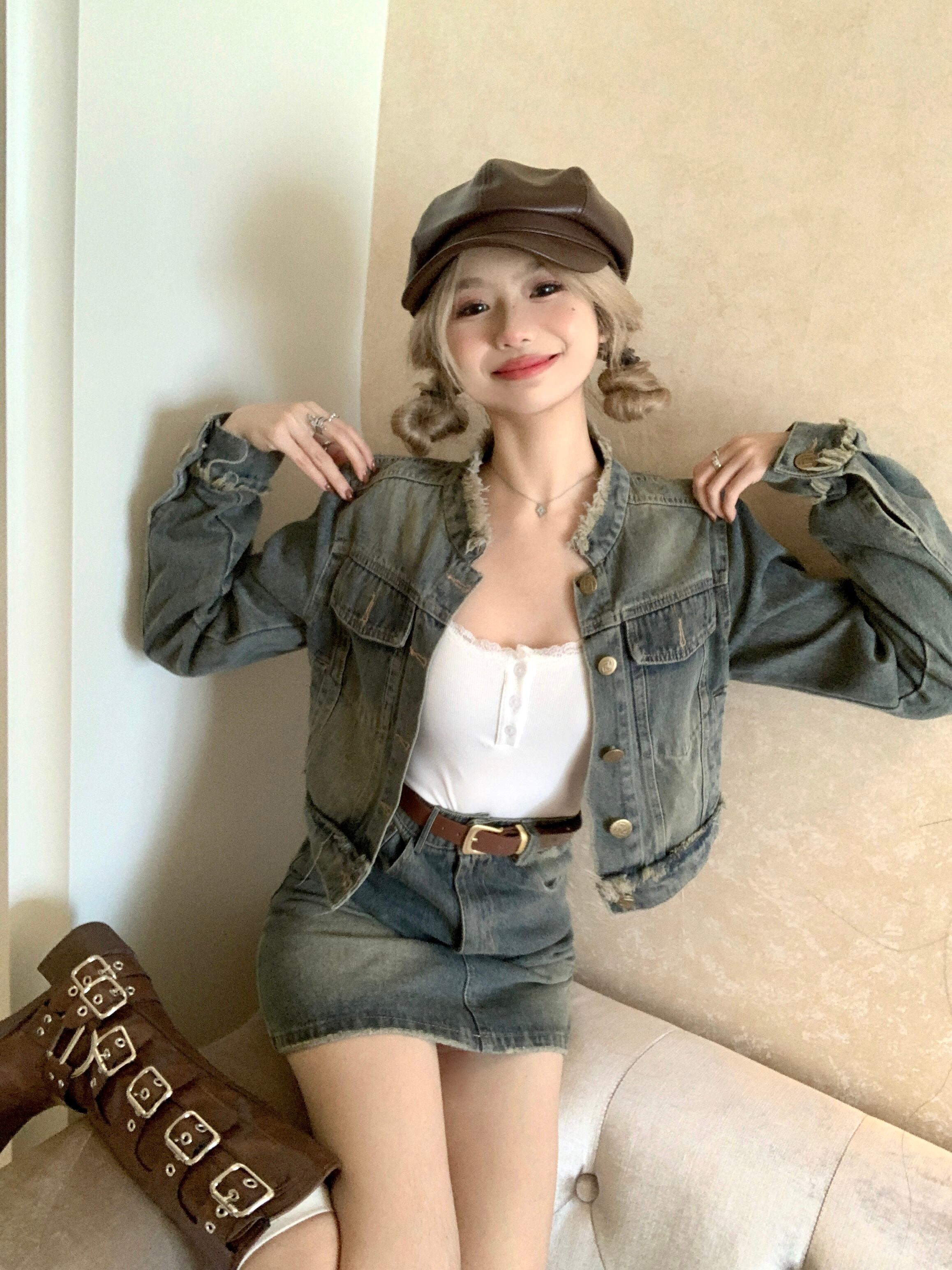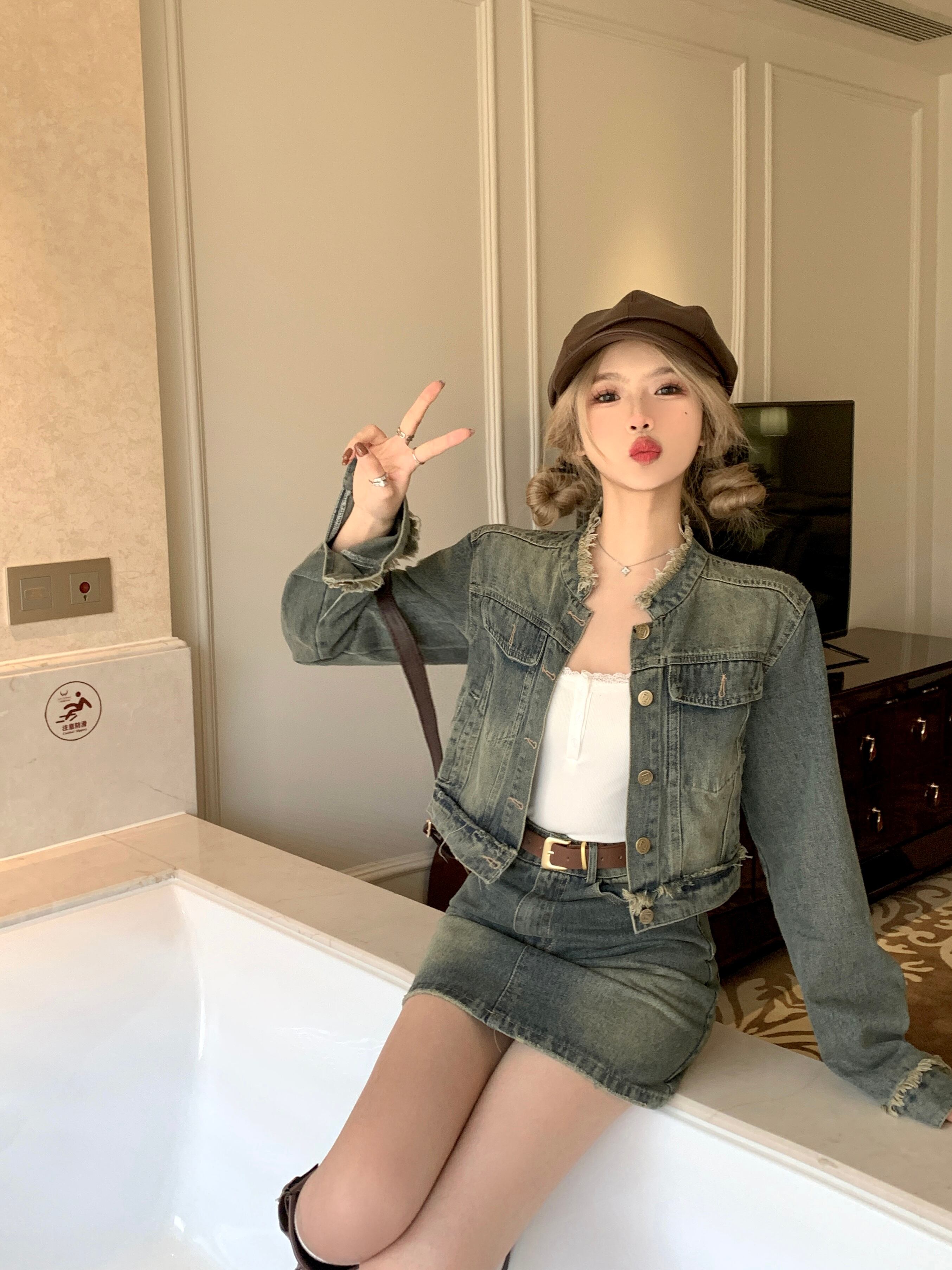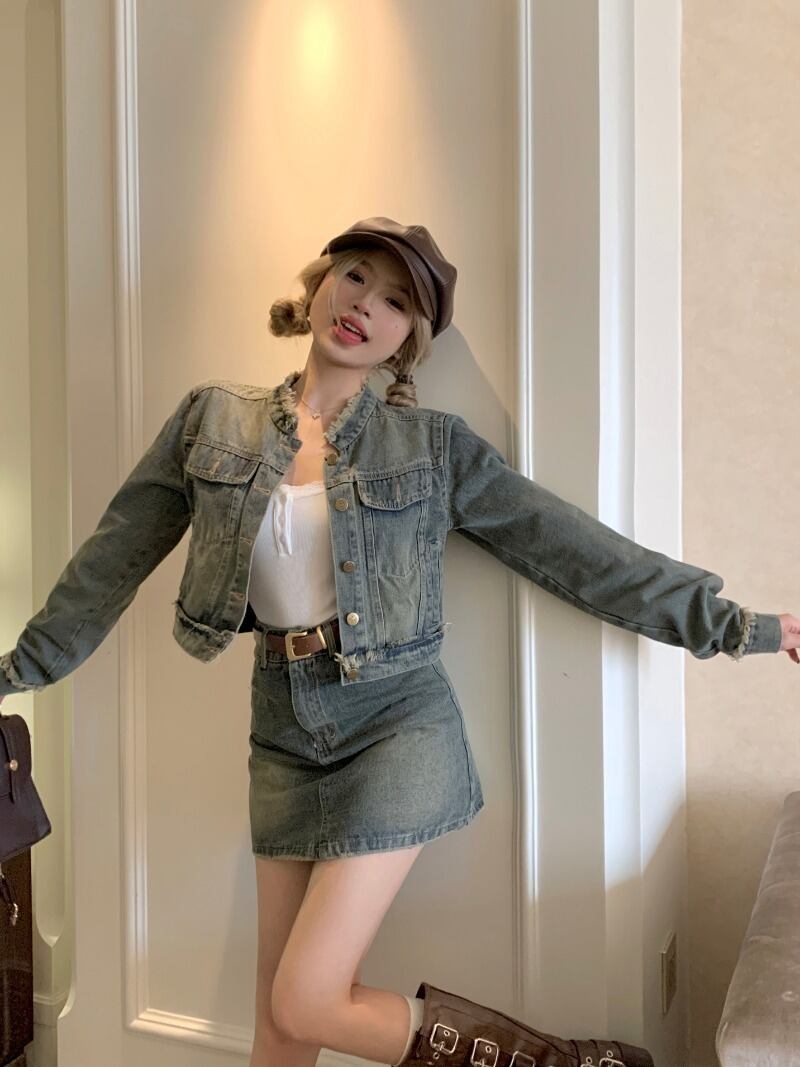 ホットガールデニムスーツ秋デニム長袖ショートコートラップヒップミニスカートツーピースセット服 ロング オータム 秋物