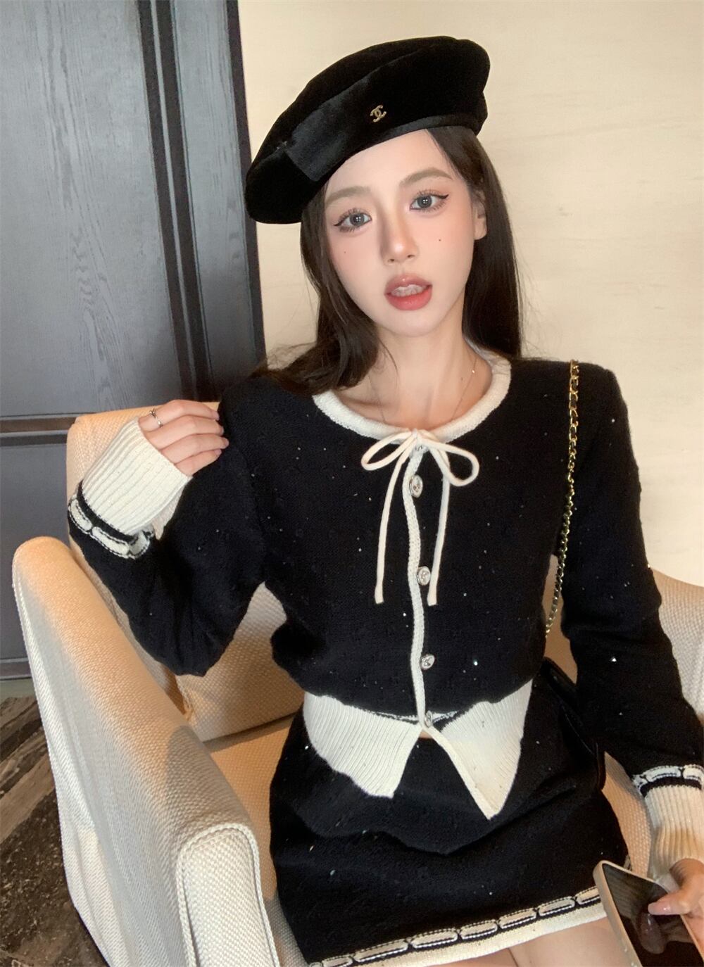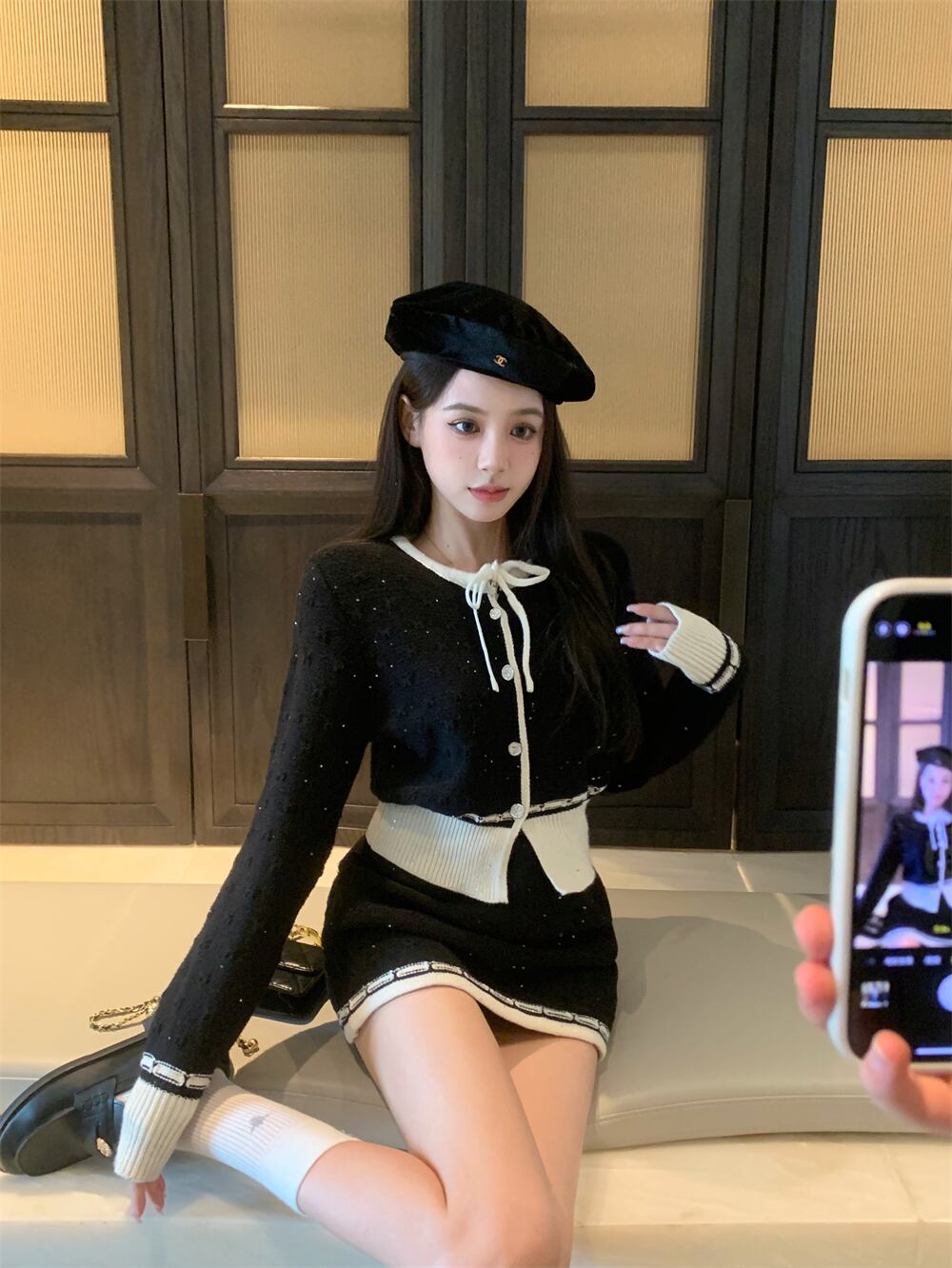 フレンチスタイルスウィートガールスーツ レディース秋コントラスト半袖ニットカーディガンウエストAラインミニスカート2点セット 大人ガーリー キュート カジュアル オータム 秋物