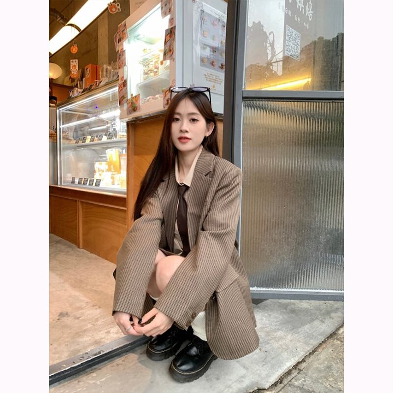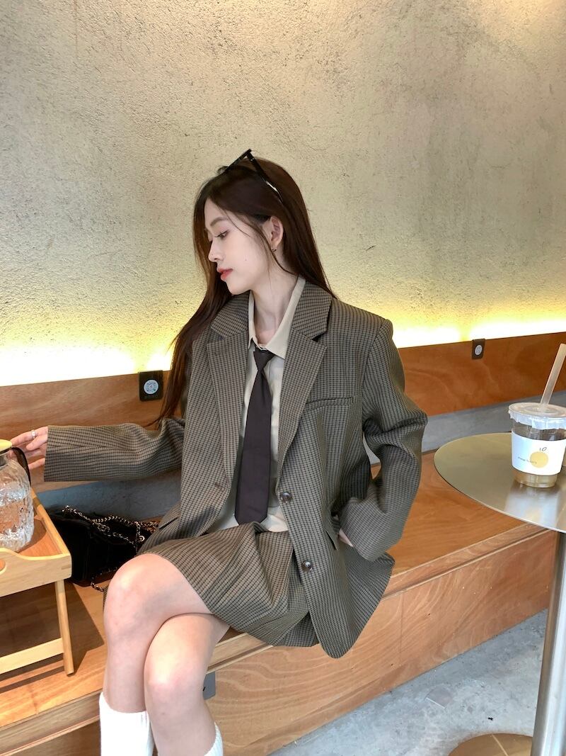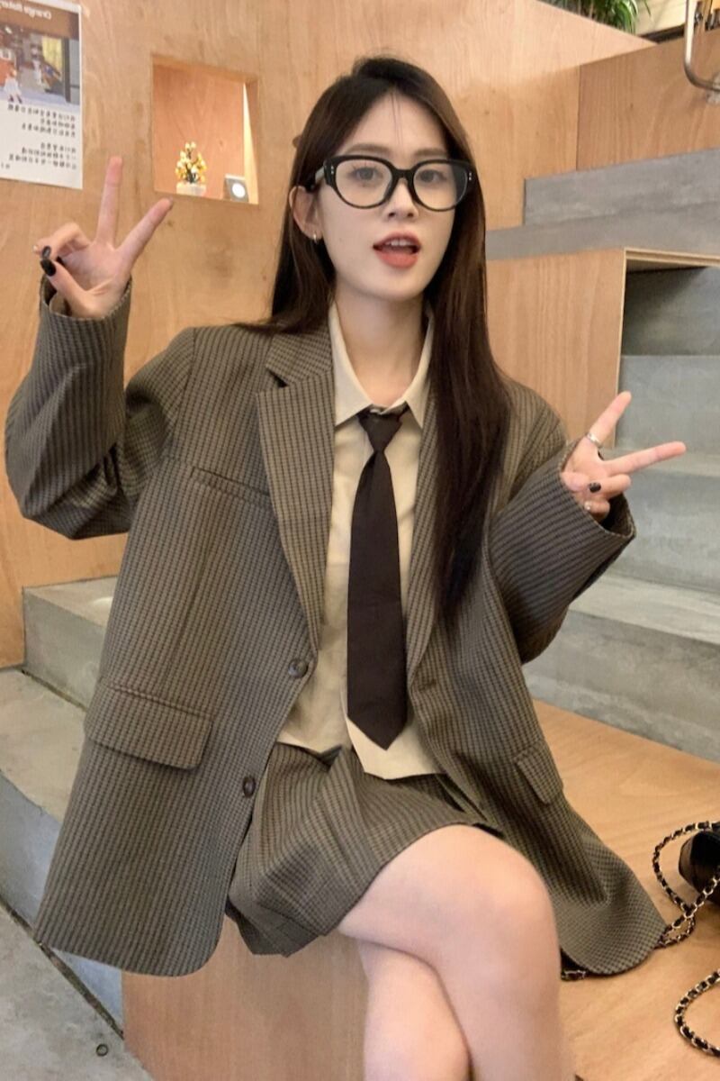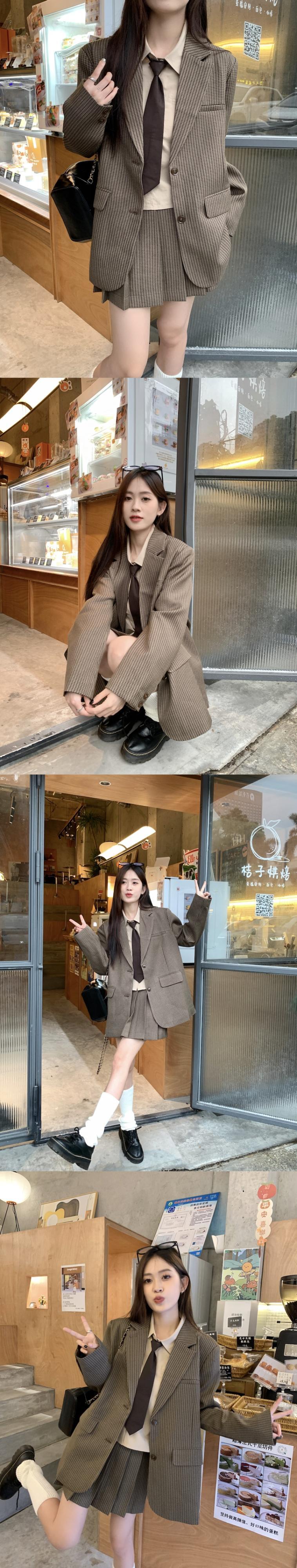 ブリティッシュアカデミースタイルセット レディース 春と秋 ブラウンチェック柄コート ショートシャツ プリーツスカート 3点セット 服 スプリング 春物 オータム 秋物