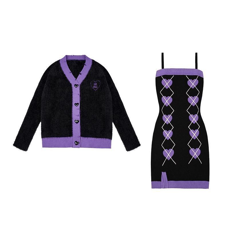 甘いホットガールスーツ秋黒紫純粋セクシーニットストラップドレスセーターカーディガンツーピースセット服 ブラック 大人ガーリー スウィート キュート カジュアル オータム 秋物 ピュア パープル