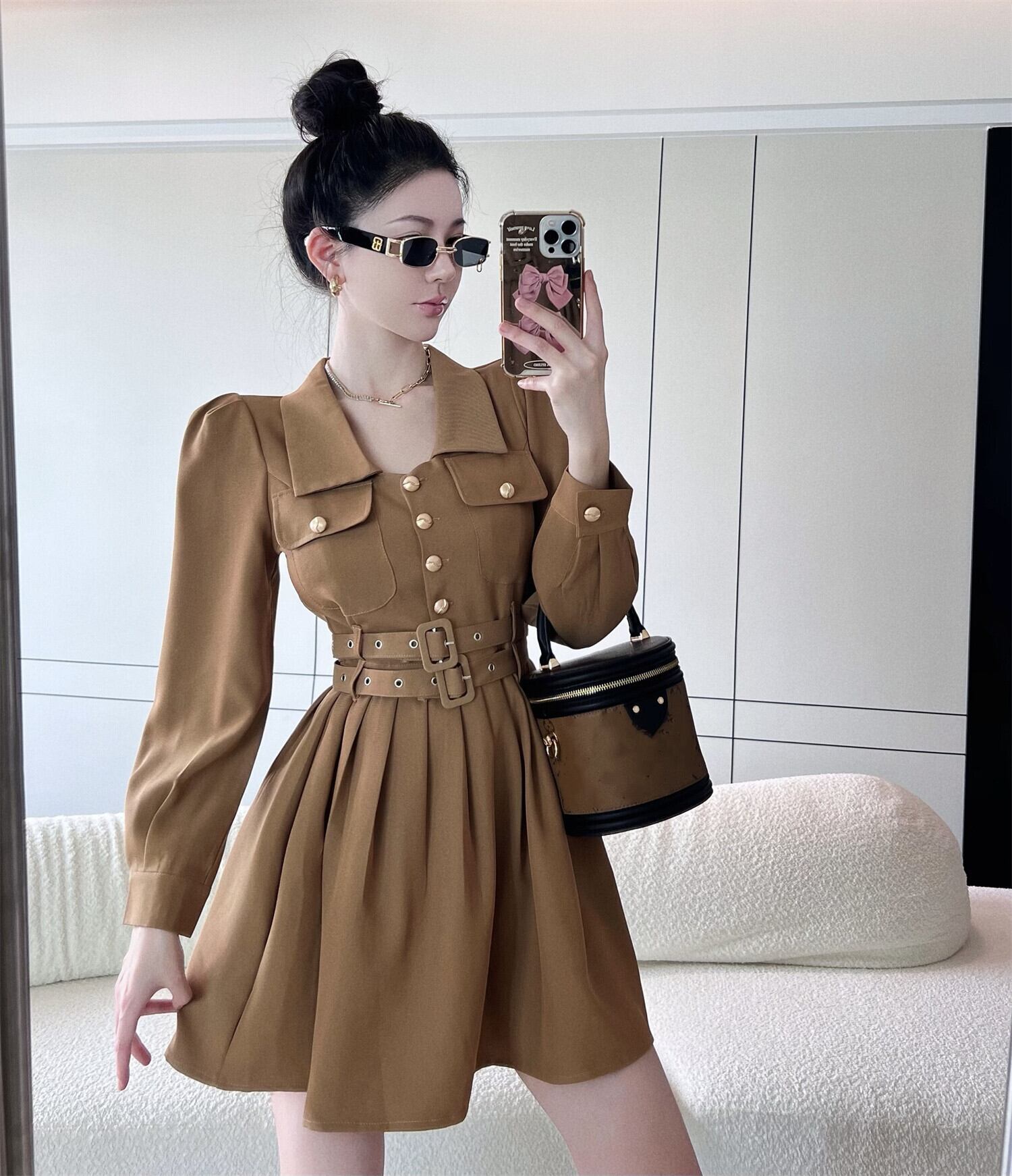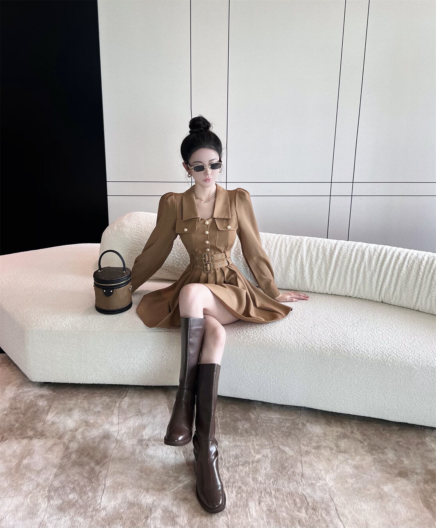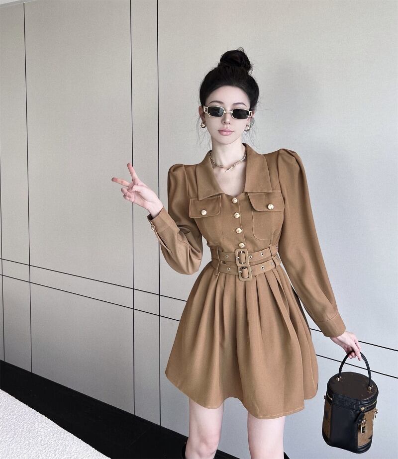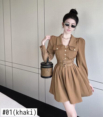 フレンチスイートガールレトロターンダウン襟スリムフィットドレス秋/冬甘いクールプリーツドレス服 大人ガーリー スウィート キュート カジュアル オータム 秋物 ウィンター 冬物