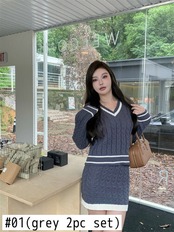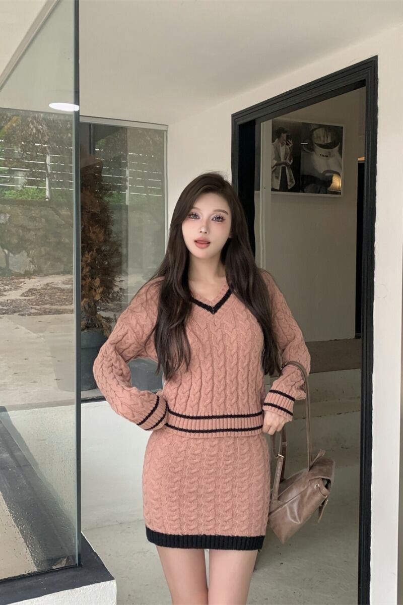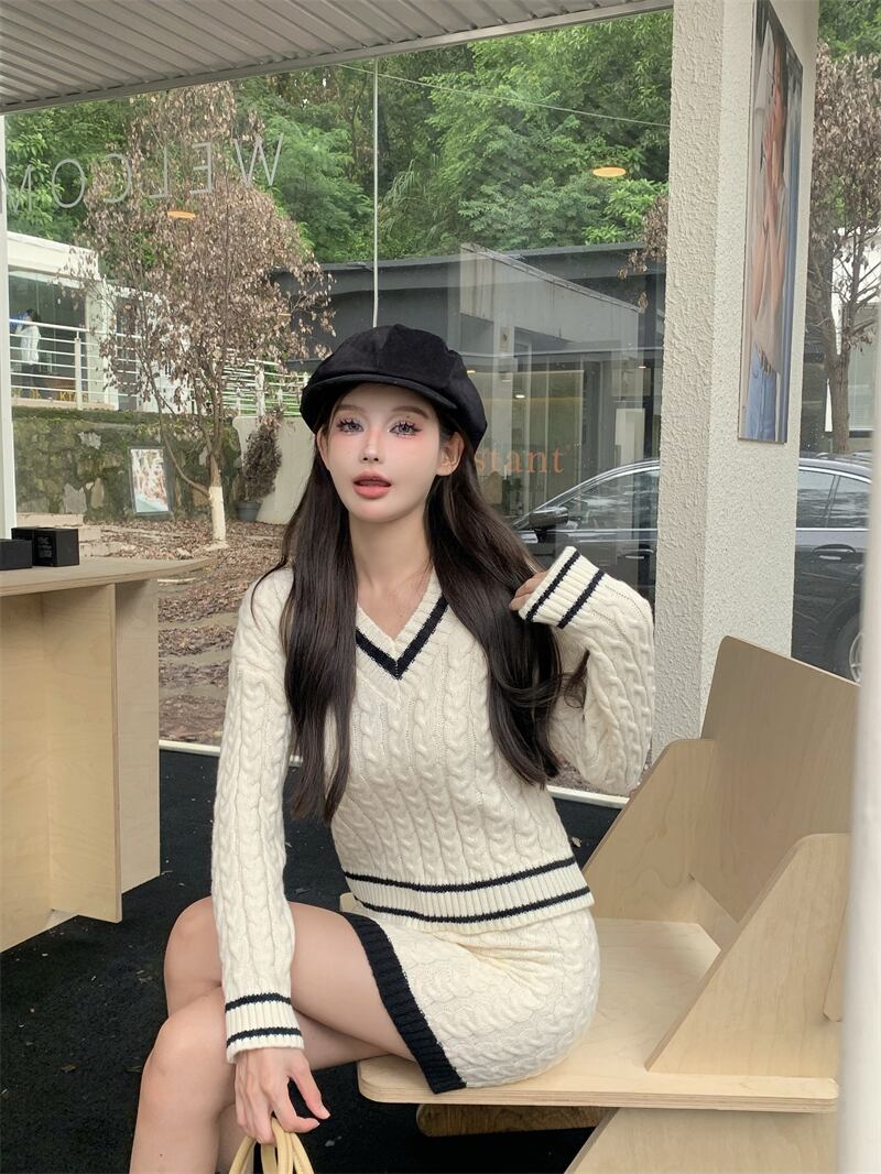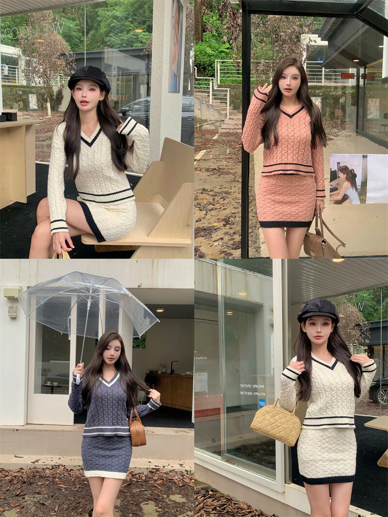 スタイルスーツ秋パッチワーク V ネックニットシャツスリムフィットラップヒップスカート 2 点セット服 オータム 秋物 Vネック