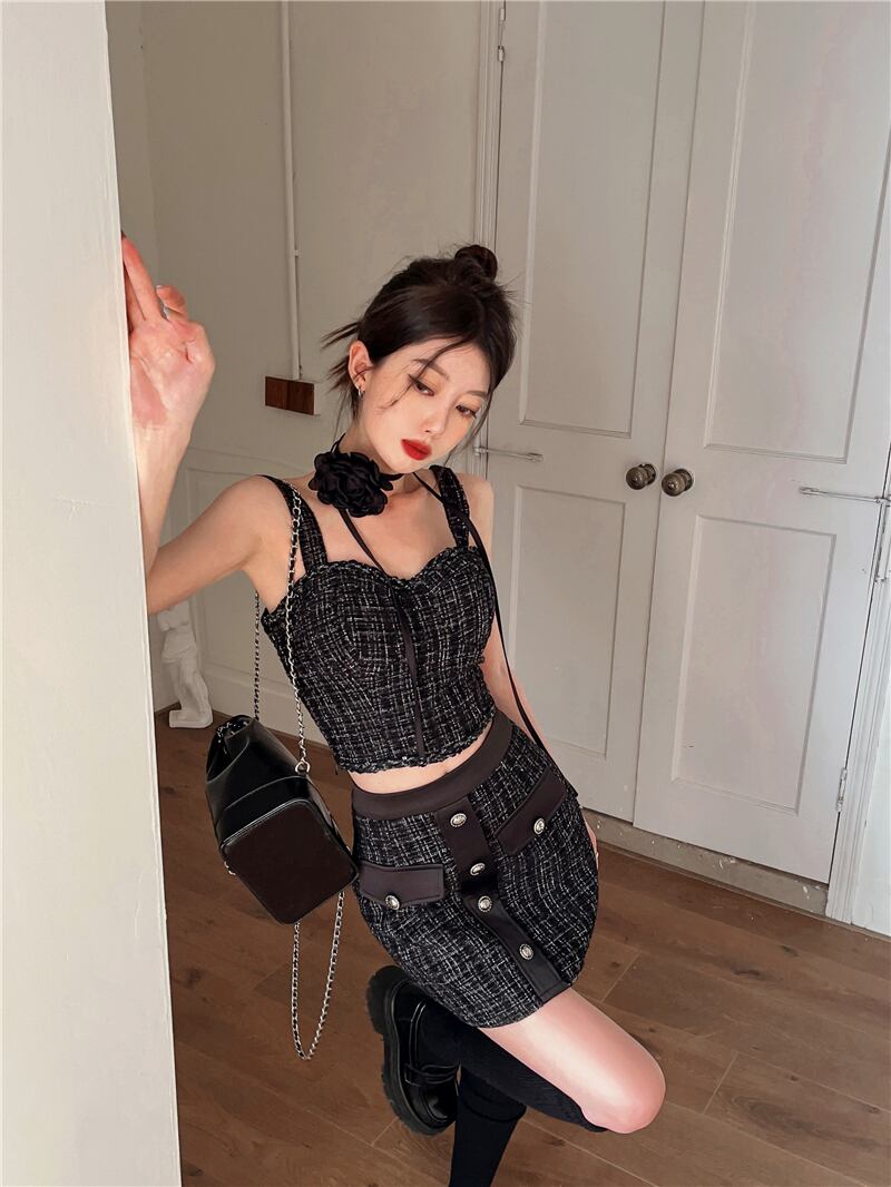 甘いホットガールツイードスーツ秋ストラップショートトップスウエストミニスカートツーピースセット服 大人ガーリー スウィート キュート カジュアル オータム 秋物