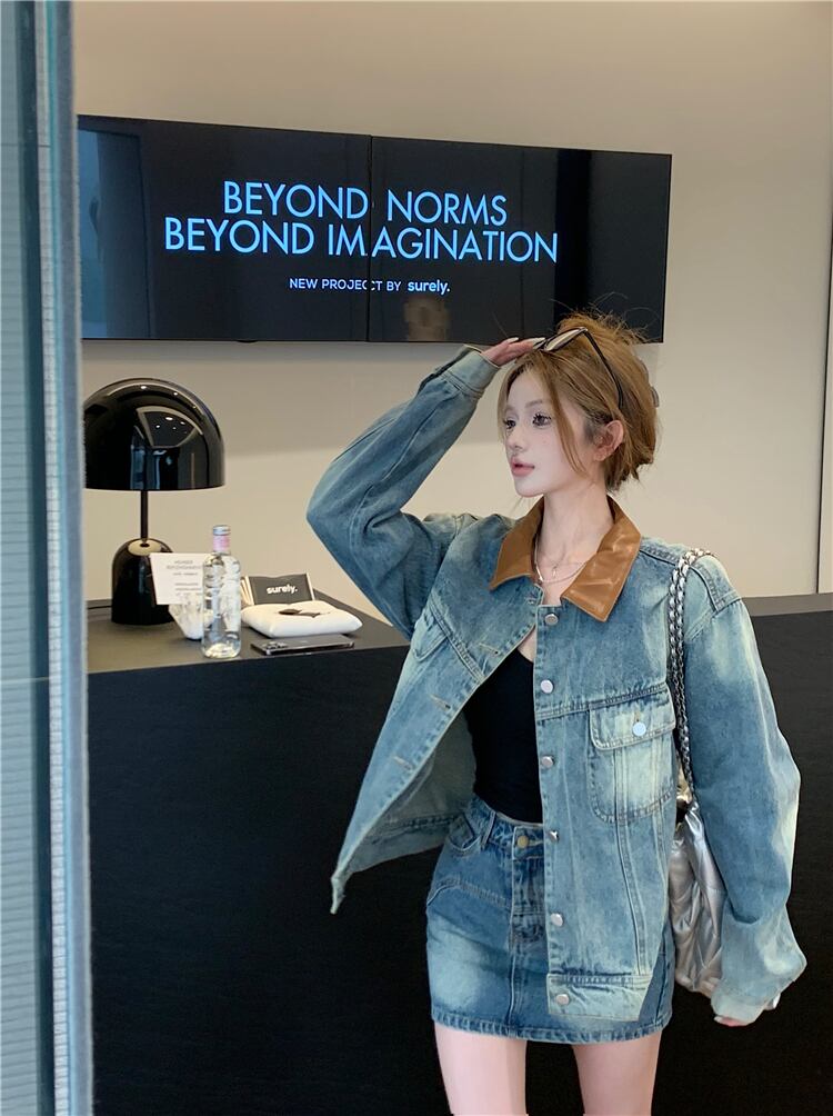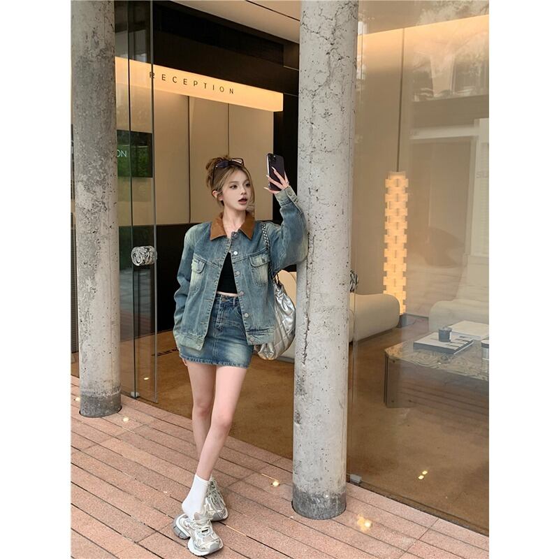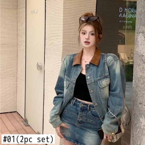 ホットガールデニムスーツ秋長袖デニムコートウエストラップヒップショートスカートツーピースセット服 ロング オータム 秋物