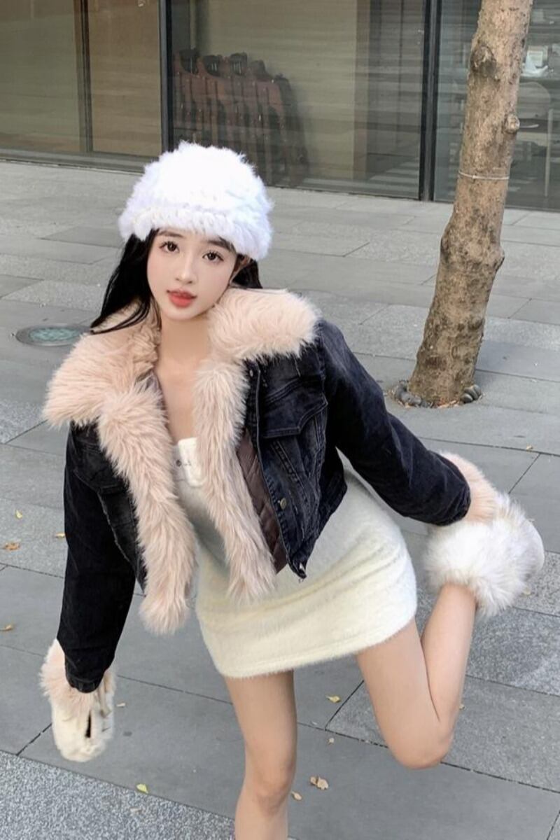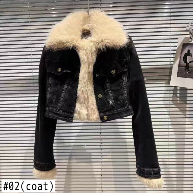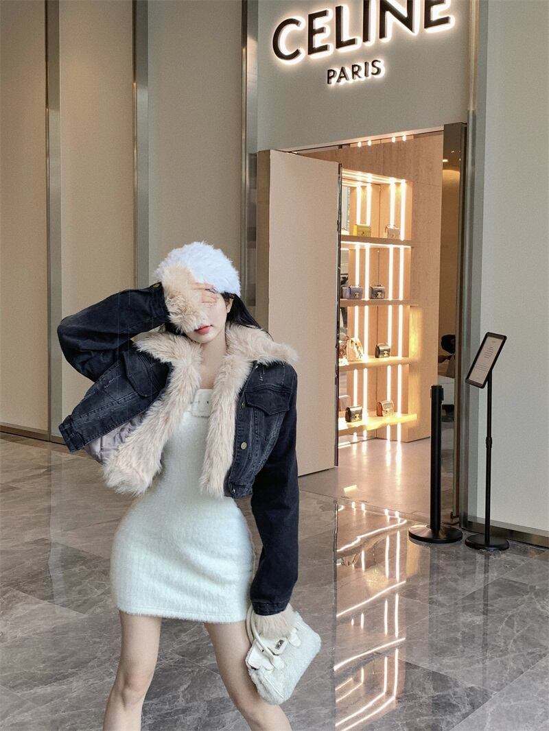 ホットガールスーツ秋毛皮襟ルーズデニムコートスリムフィットショートストラップドレスツーピースセット服 オータム 秋物