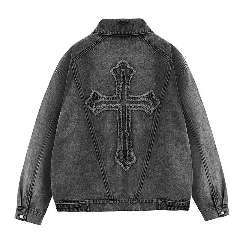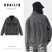 甘いホットガールデニムジャケット秋ターンダウン襟クロスパッチウォッシュオールドデニムルーズコート服 大人ガーリー スウィート キュート カジュアル オータム 秋物