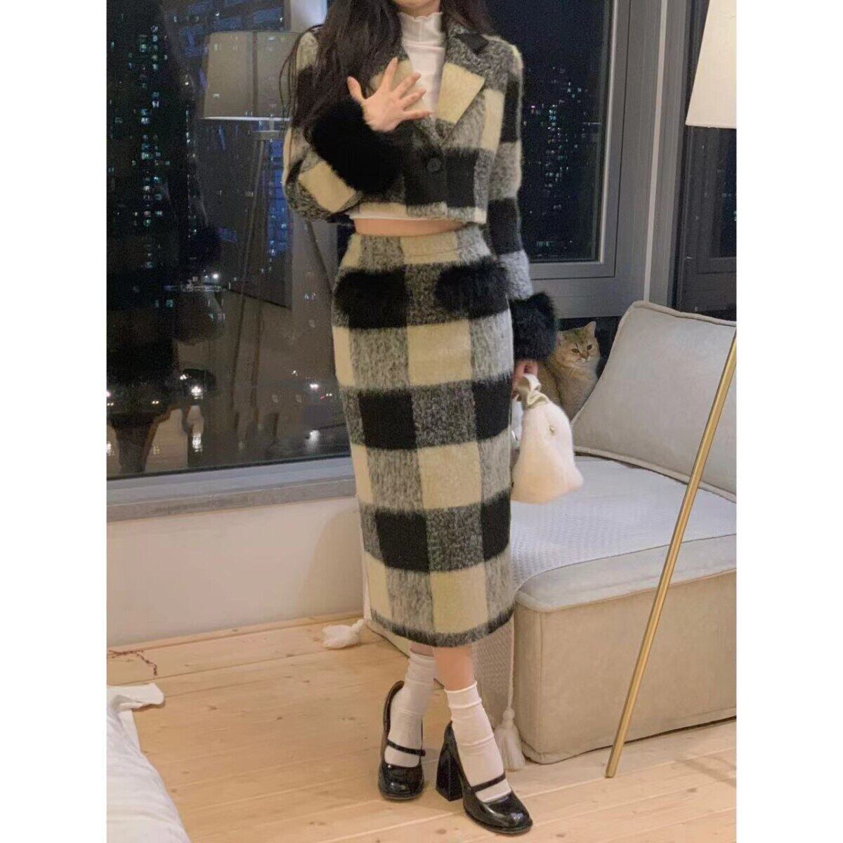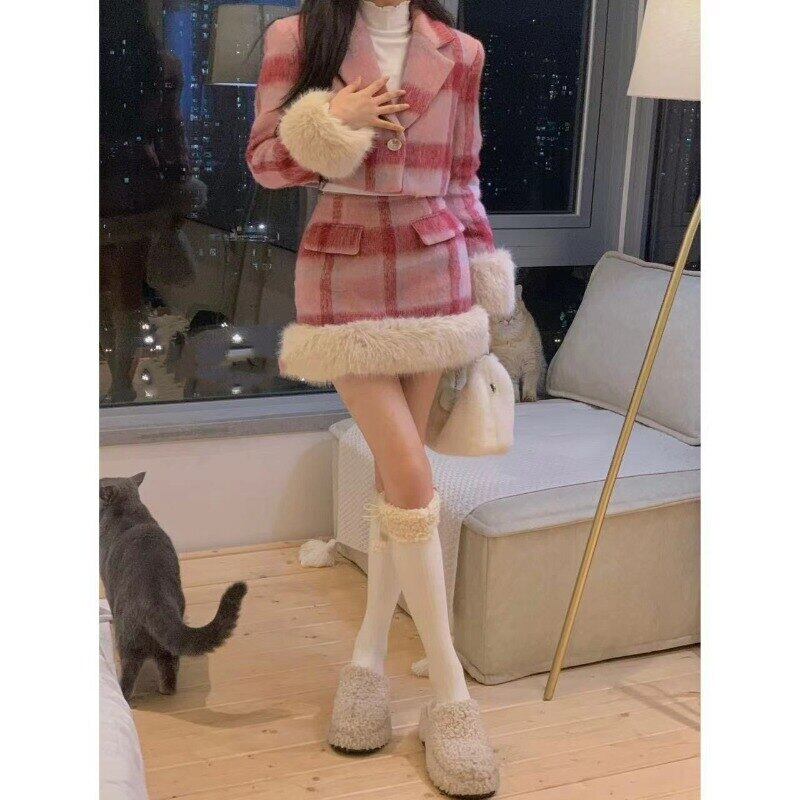 甘いホットガールスーツ秋/冬チェック柄ウールジャケットウエストミニスカート 2 点セット服 大人ガーリー スウィート キュート カジュアル オータム 秋物 ウィンター 冬物