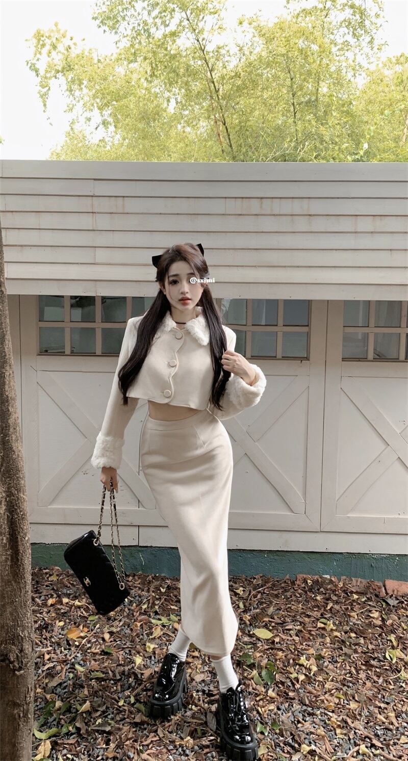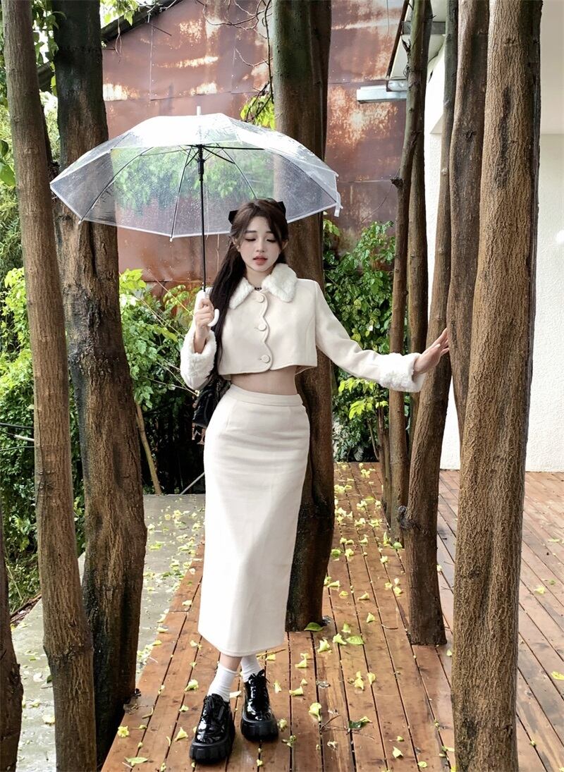 甘いホットガール白スーツ秋ターンダウン襟ショートコートウエストロングスカート 2 点セット服 ホワイト 大人ガーリー スウィート キュート カジュアル オータム 秋物