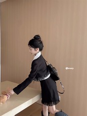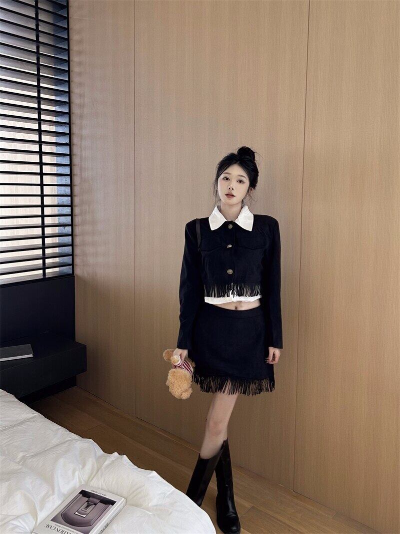 フレンチホットガールスーツ秋長袖テルショートトップ A ラインミニスカート黒 2 点セット服 ロング ブラック オータム 秋物 Aライン