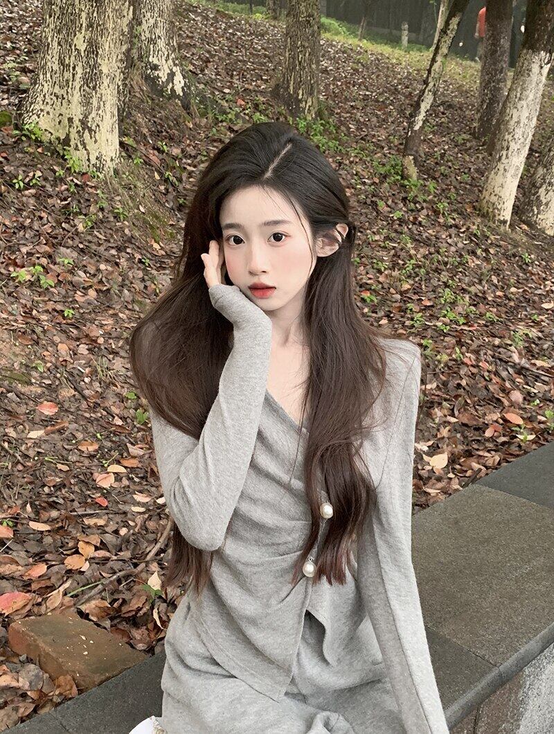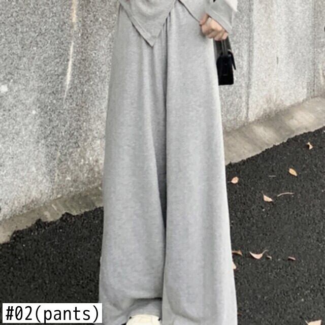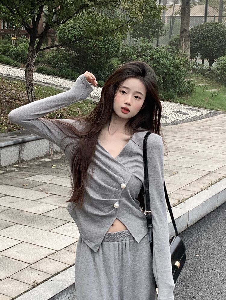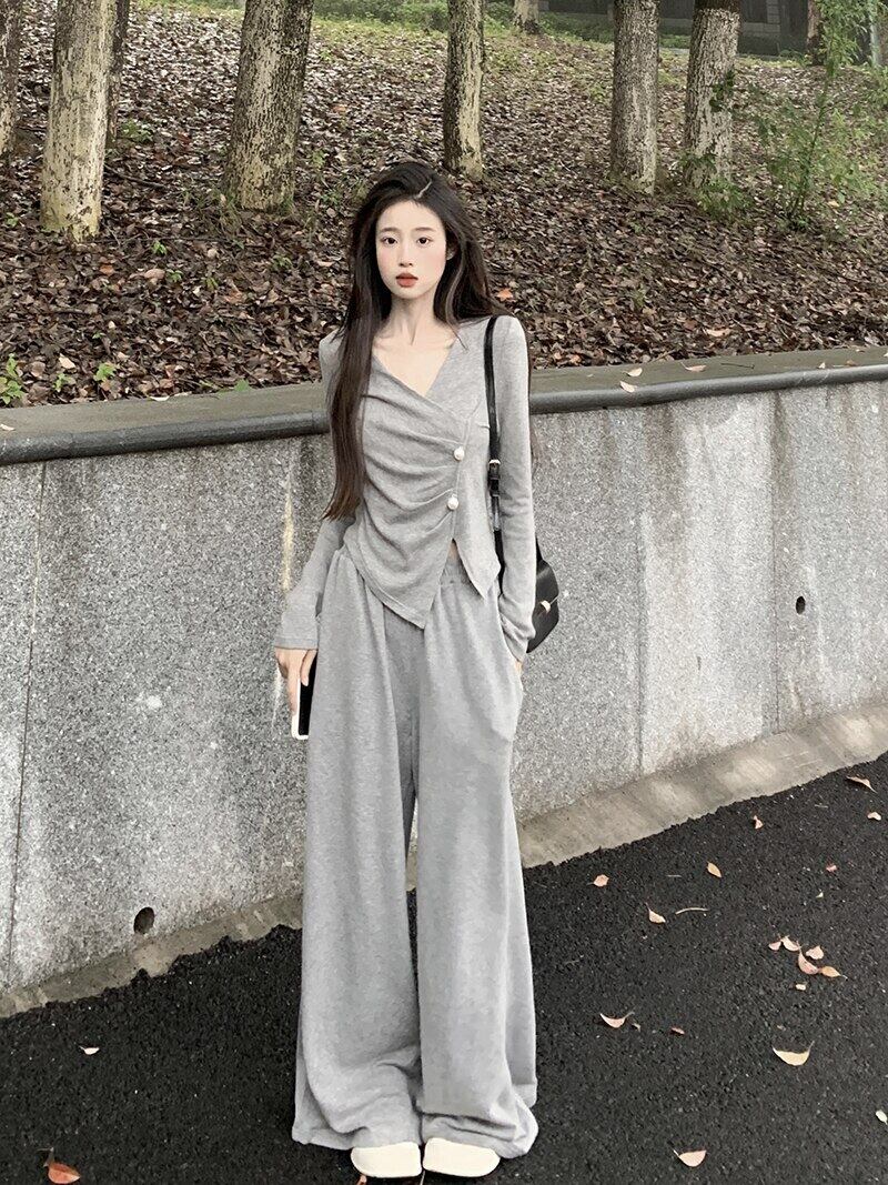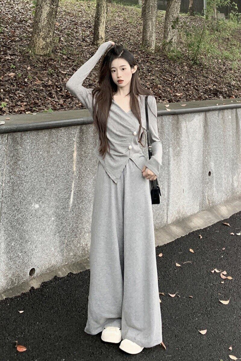 甘いホットガールスーツ秋 V ネック 2 つボタン長袖 Tシャツウエスト弾性ワイドレッグパンツ 2 点セット ロング エラスティック 伸縮 大人ガーリー スウィート キュート カジュアル オータム 秋物 Vネック ワイドパンツ