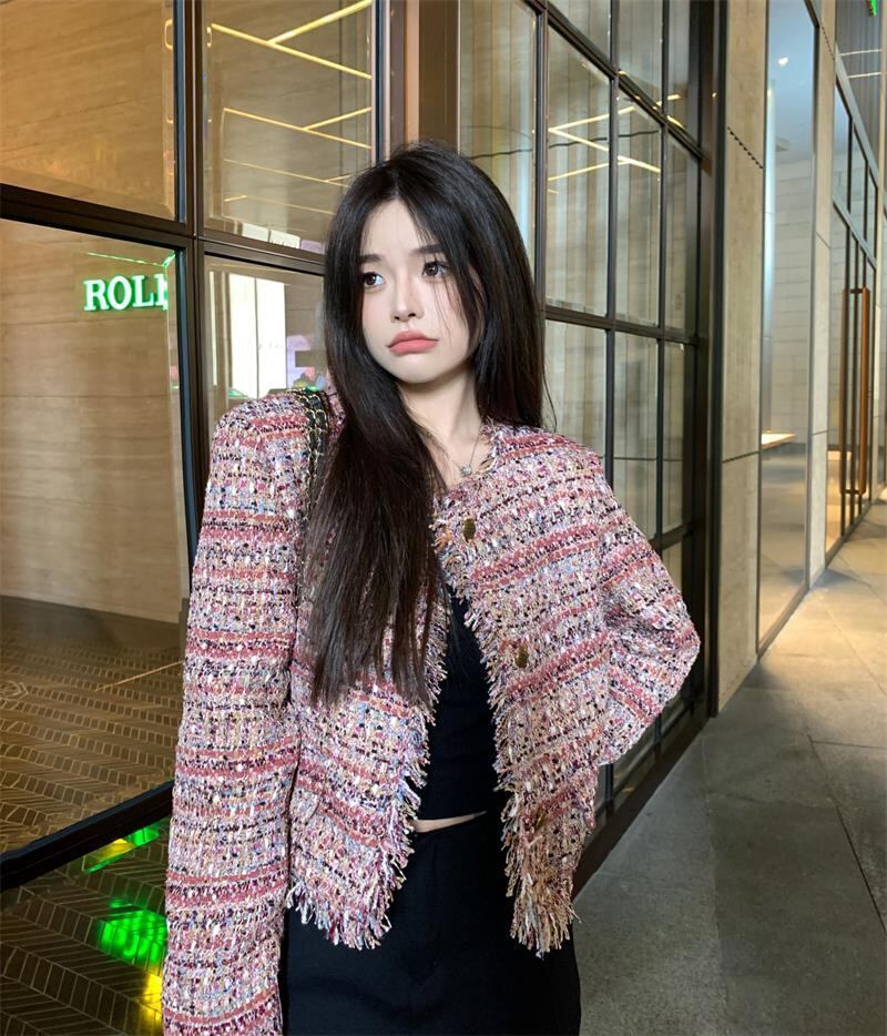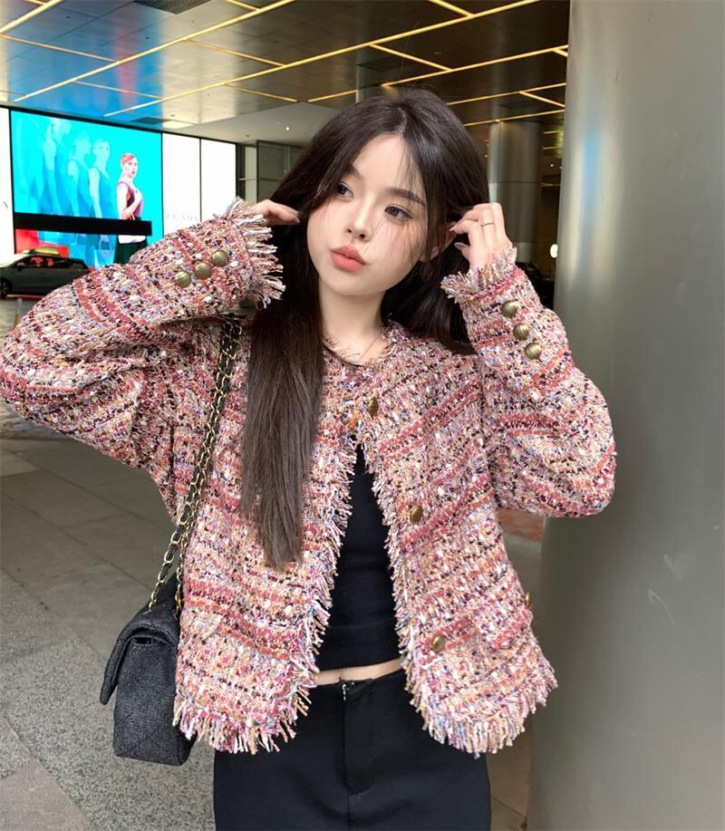 甘いホットガールツイード織ジャケット秋長袖電話ルーズラウンドネックジャケットトップ服 ロング 大人ガーリー スウィート キュート カジュアル オータム 秋物 Oネック