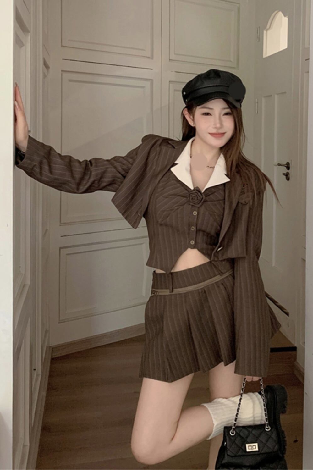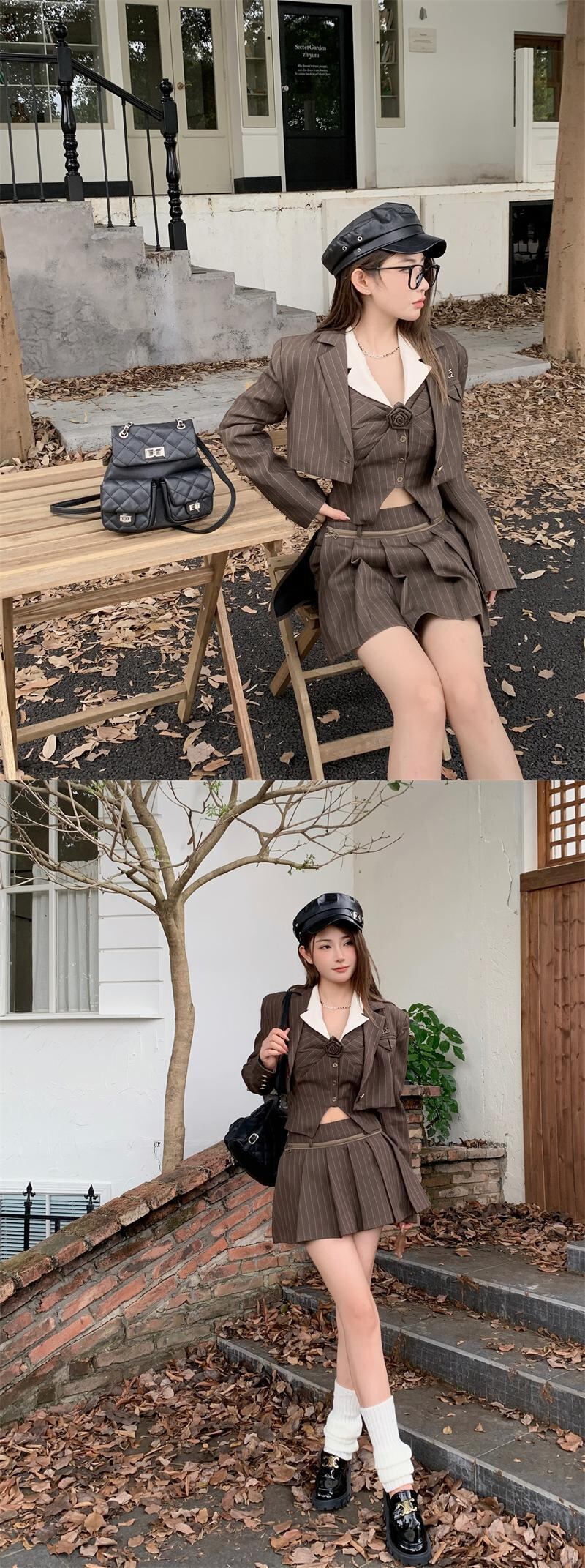 ホットガールズレトロプレッピースタイルスーツ秋ストライプコートショートホルターネックタンクトッププリーツスカート 3 点セット オータム 秋物