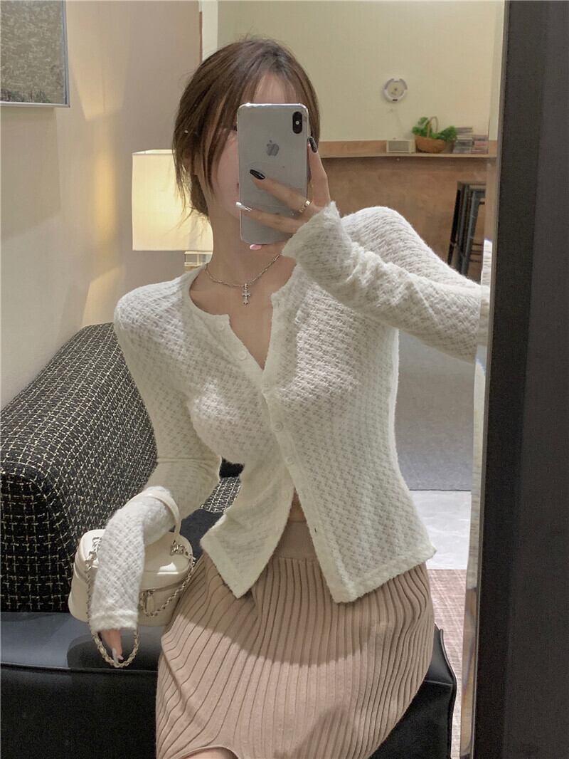フレンチスイートガール純粋セクシーシングルブレストニットカーディガン秋スリムフィット長袖セータートップ服 ロング 大人ガーリー スウィート キュート カジュアル オータム 秋物 ピュア
