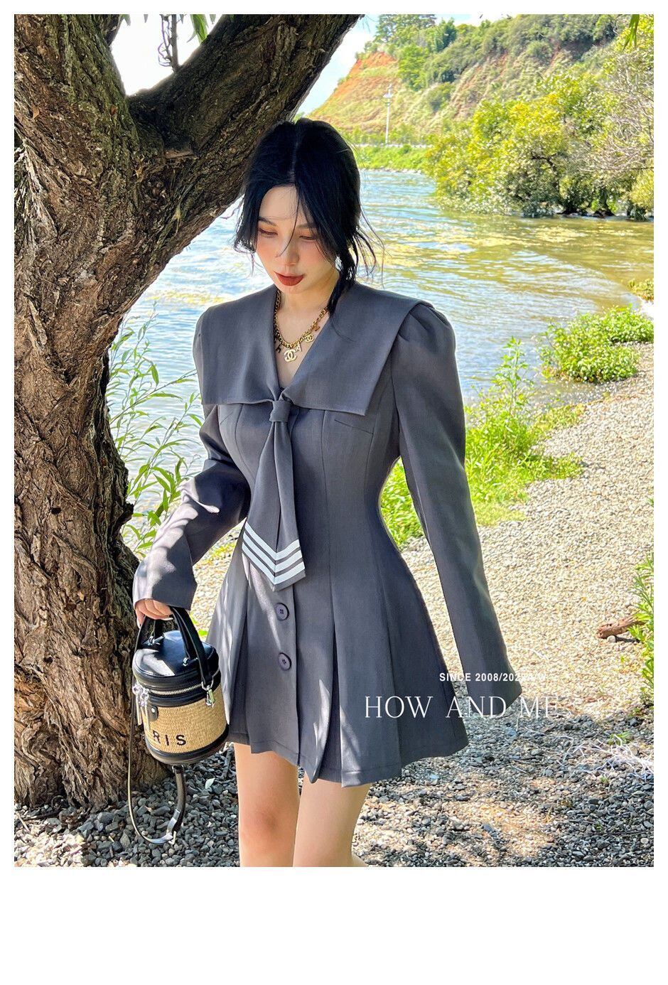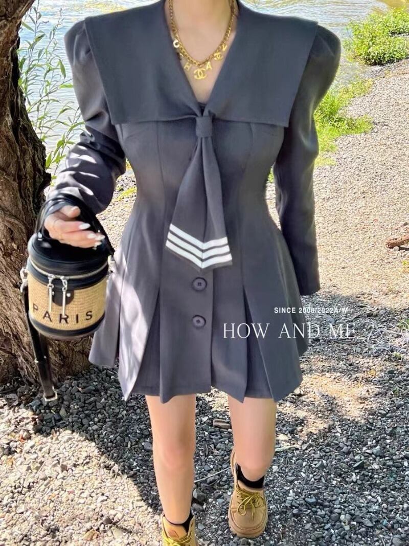 甘いホットガールプレッピースタイルドレス春セーラー襟 A ラインシングルブレストプリーツショートドレス服 大人ガーリー スウィート キュート カジュアル スプリング 春物 Aライン